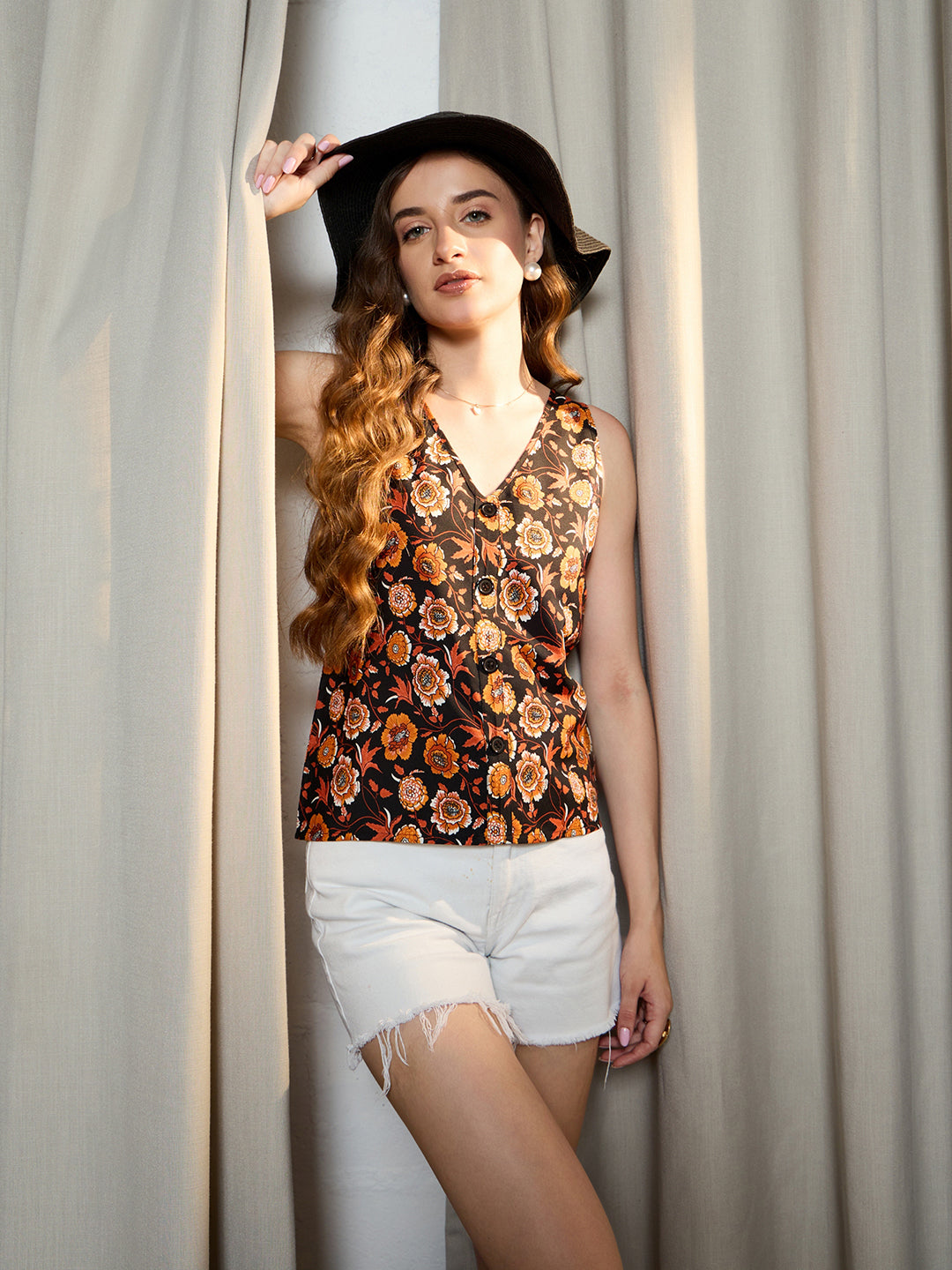 Berrylush Women Black & Orange Floral Printed V-Neck Sleeveless V-Back Front Button-Up Regular Top