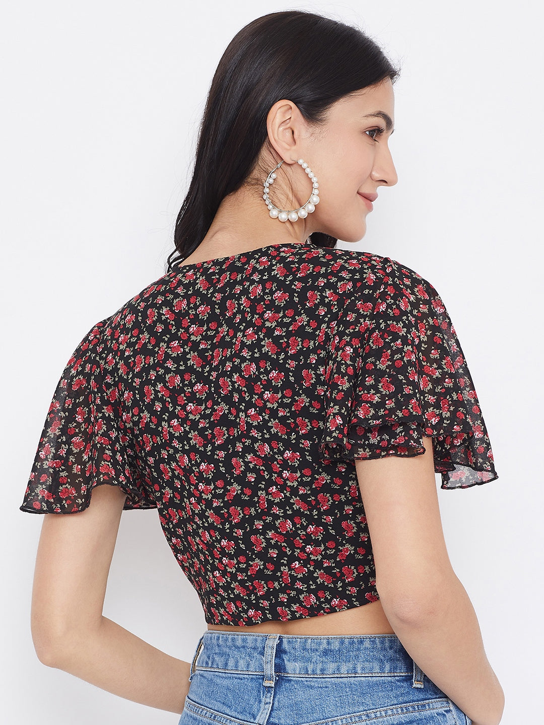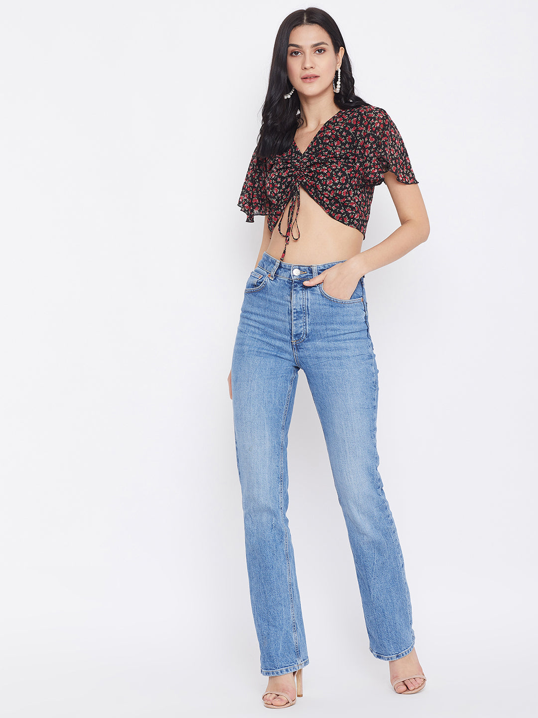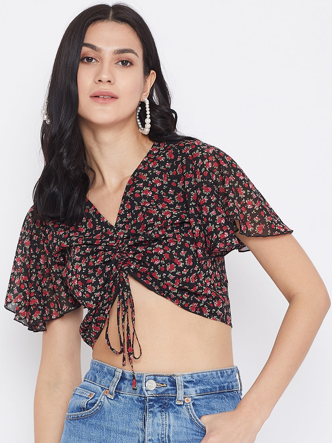 Rejuvenate your wardrobe with the addition of trendy style options just like this gorgeous Navy Blue & Red Floral Printed V-Neck Front Tie-Up Gathered Crop Top designed by Berrylush. Made from high-quality polyester fabric to keep this top light and breathable for your skin. Designed with a deep V-neck design gives your neckline an alluring appeal while the short flared sleeves add fascinating charm to this top. Also, the wrap design of this top gets you a curve-defining silhouette. Go shopping with your friends looking stunning by pairing this astonishing crop top with your favourite blue denim jeans, headband, and caged heels.