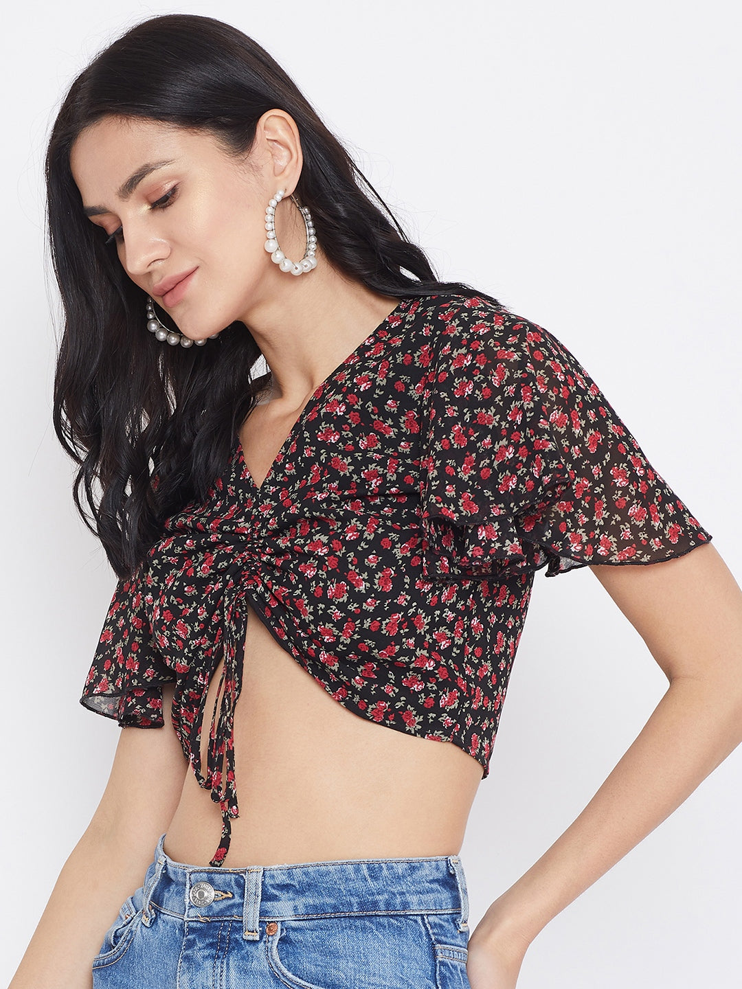 Berrylush Women Navy Blue & Red Floral Printed V-Neck Front Tie-Up Gathered Crop Top