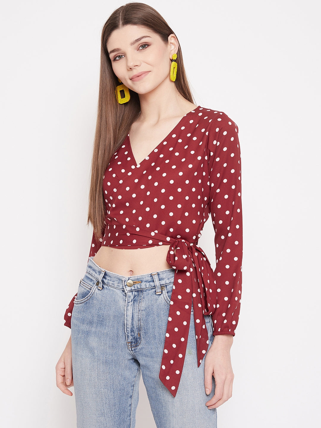Berrylush Women Red Polka Dot Printed Wrap Tie Crop Top