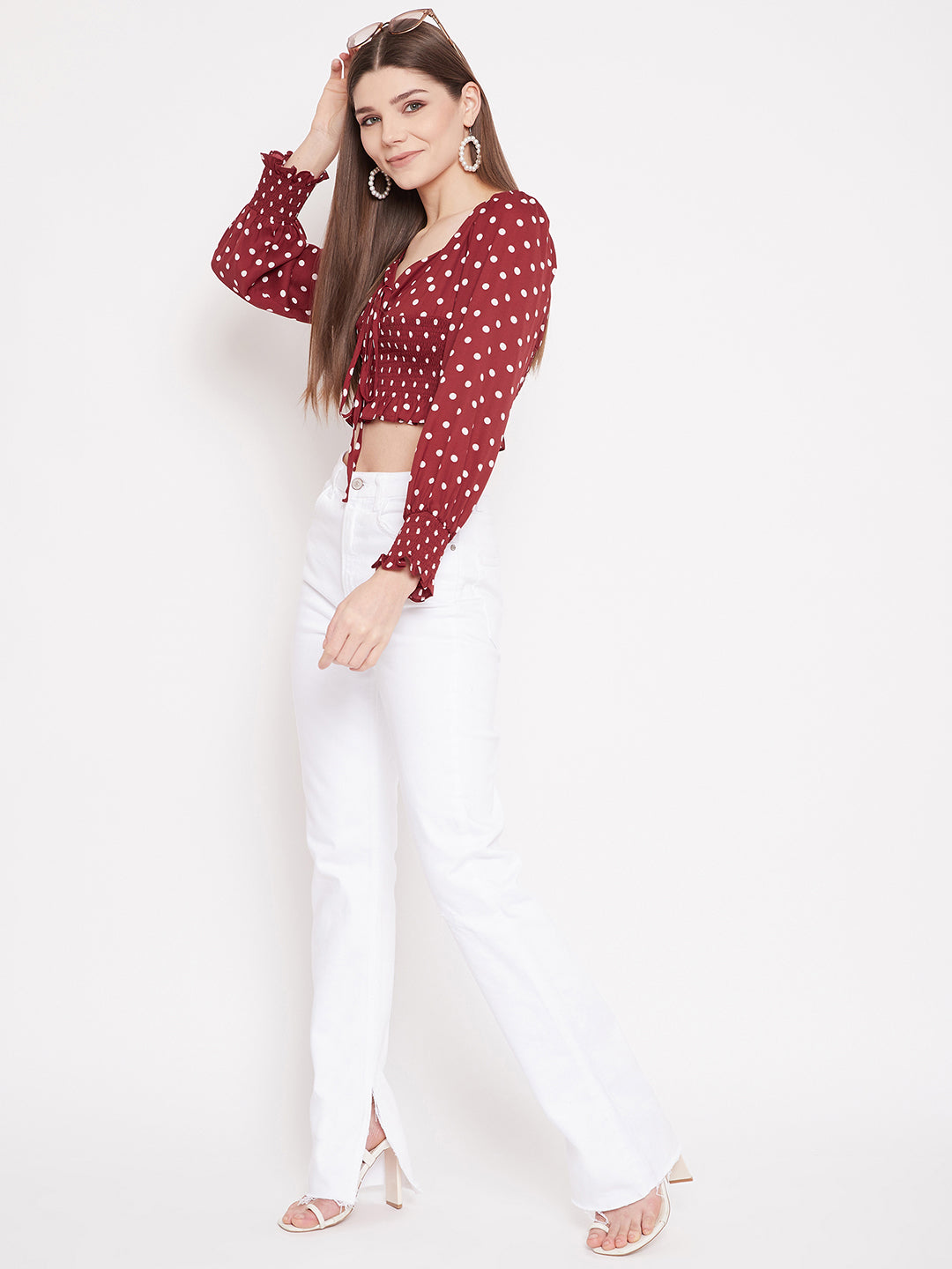 The Berrylush Red Polka-Dot Front Tie Shirred Crop Top is a fun and flirty top perfect for any occasion! This gorgeous crop top features V-neckline, a fitted bodice, and a pleated hem for creating a charming look. All-over white polka dot print gives a touch of style to this red-colored top. Designed with bishop-styled sleeves and cropped length that adds an attractive edge to this top. It also has a stylish tie-knot detailing that complements its overall charming look. Dress it up with a pair of skinny jeans and a cute pair of loafers for a fashionable appearance.