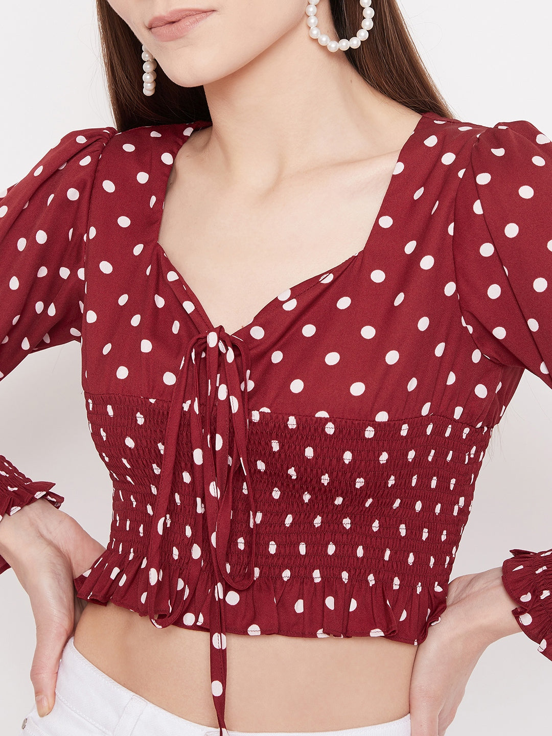 Berrylush Women Red Polka-Dot Print Front Tie Shirred Crop Top
