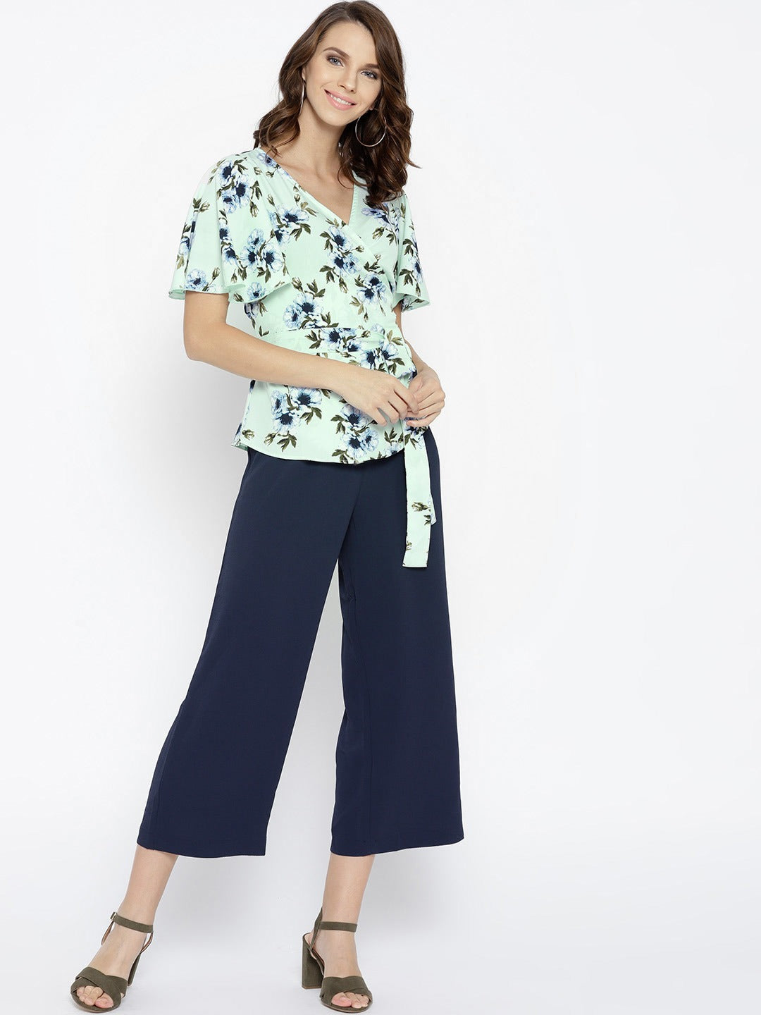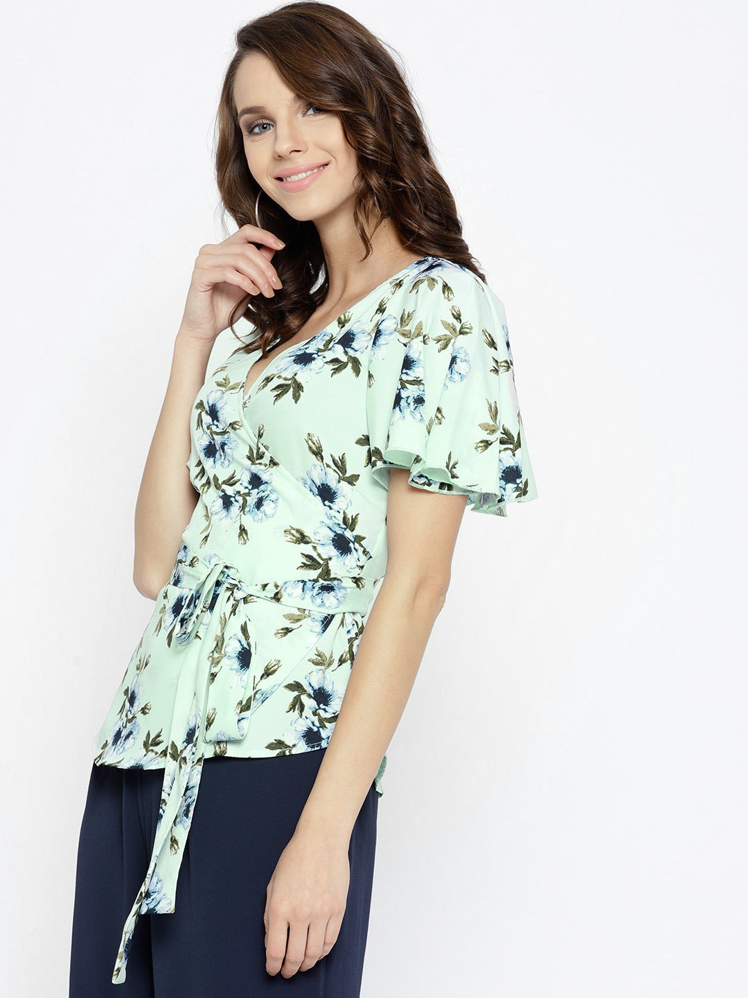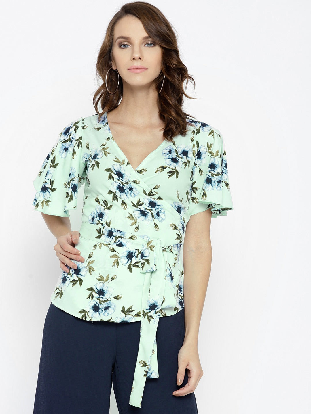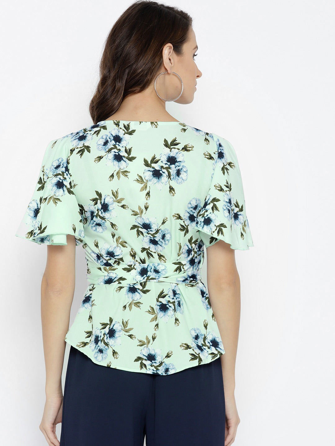 Berrylush Women Sea Green & Blue Floral Printed V-Neck Waist Tie-Up Crepe Wrap Regular Top