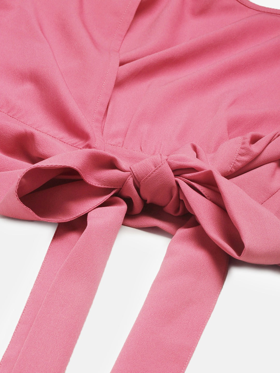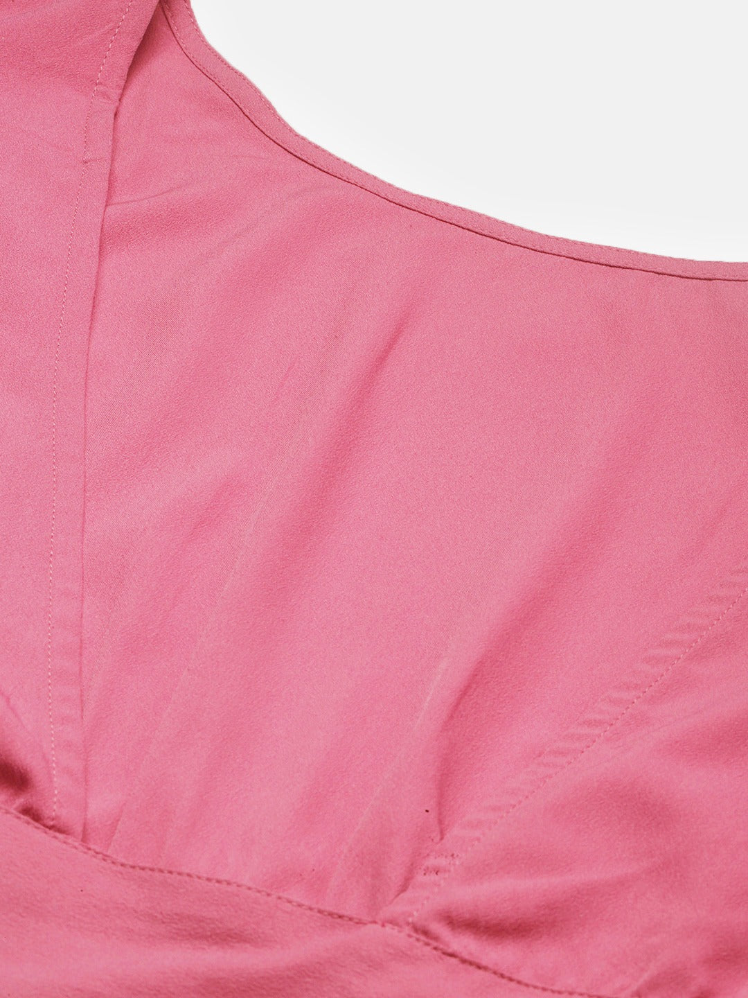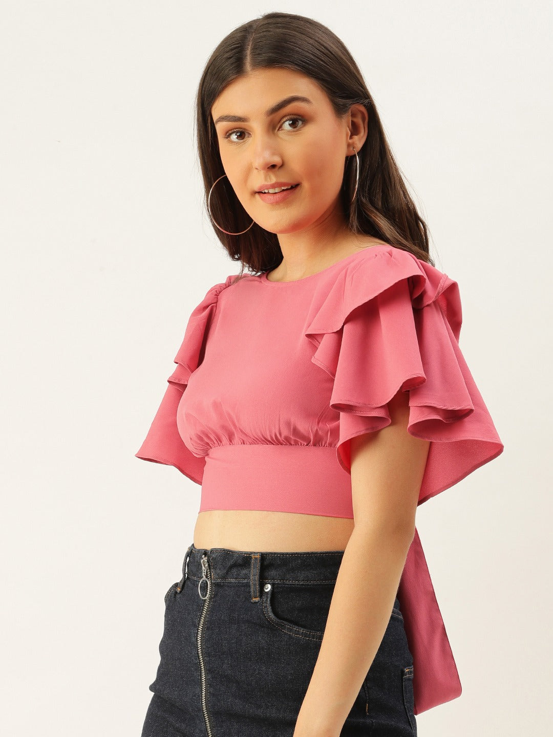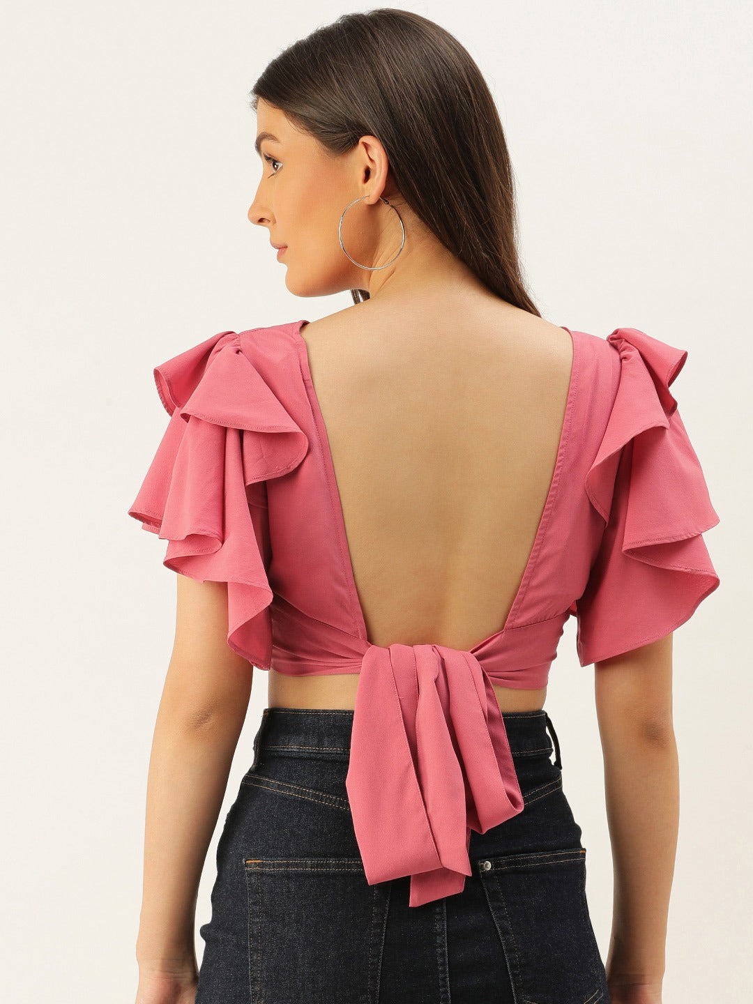 Berrylush Women Solid Rose Pink Open-Back Blouson Crop Top
