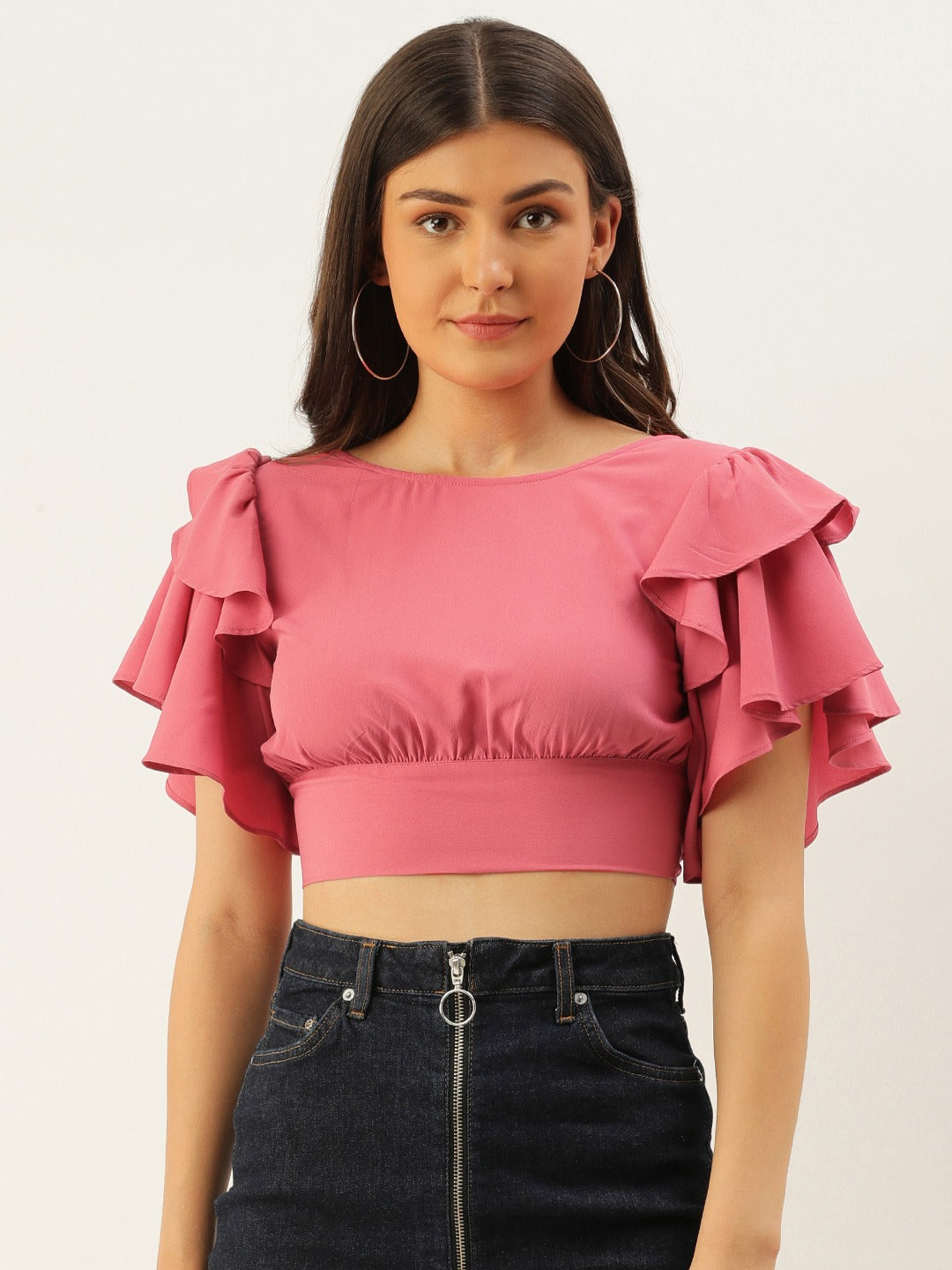 Berrylush Solid Dark Peach Open-Back Blouson Crop Top launched with the view of defining the feminine charm in a casual way. Blouson cut matched with the banded waist serves the purpose of balancing your gorgeous curves. Simply with the addition of decorative layered ruffles this crop top is a gem for casual hangouts. For a perfect fashion check, pair this outfit with a black pencil skirt and ankle boots; for jewelry opt for sleek earrings. An embellished purse will add an extra star to your appearance but do not embrace any neckpiece as your top is already having a flattering round neckline. Buy this curve-flaunting crop top from Berrylush and add an opulence flair to each step you take.