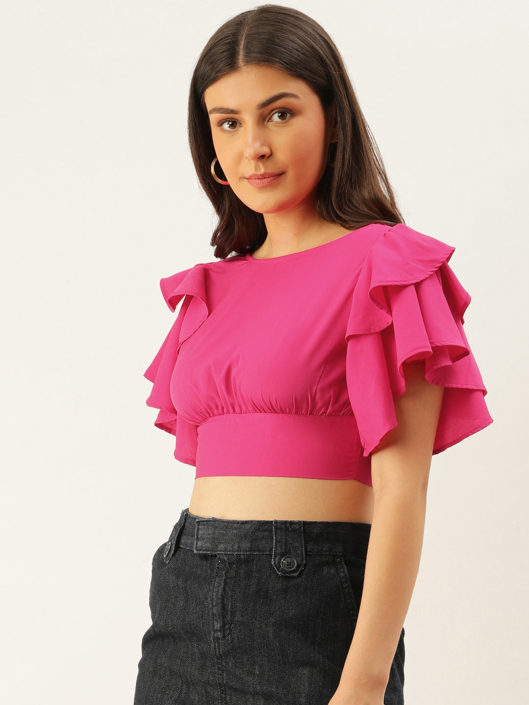 • Ruffled detailing at the bodice adds a captivating flair to this crop top