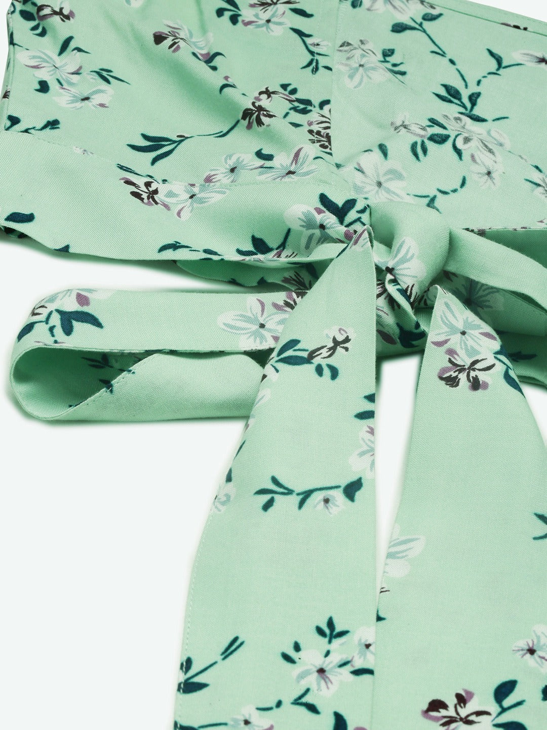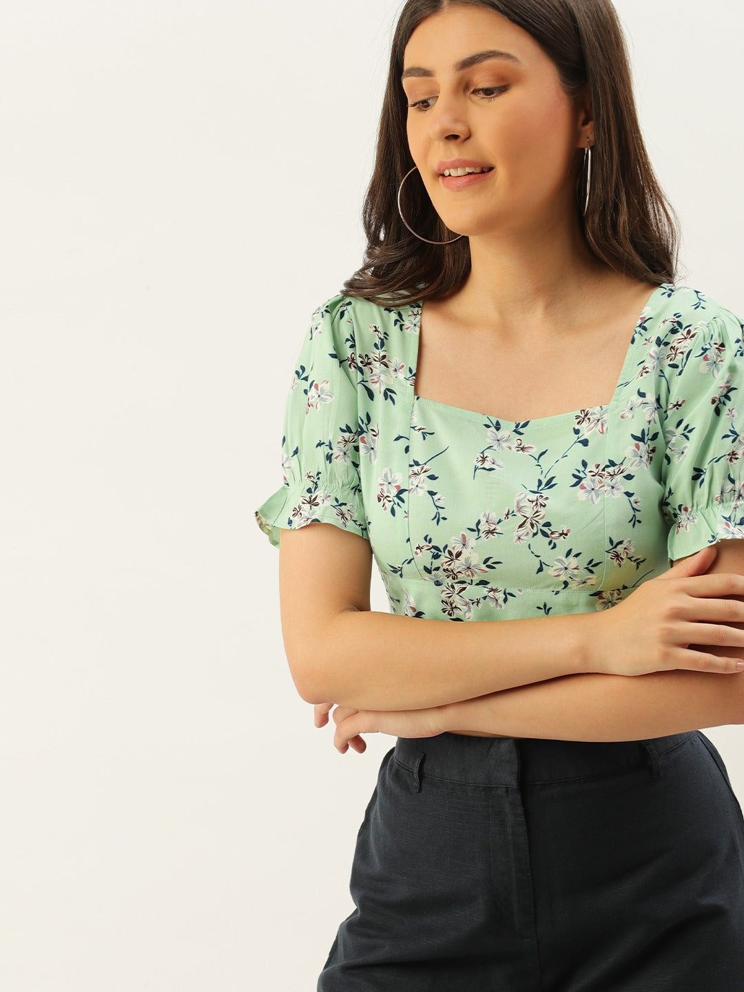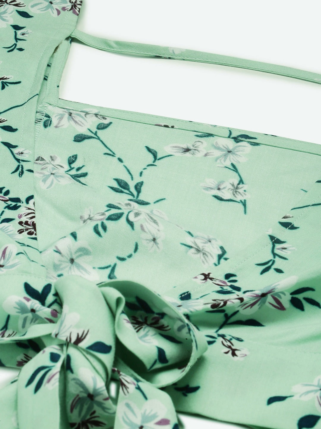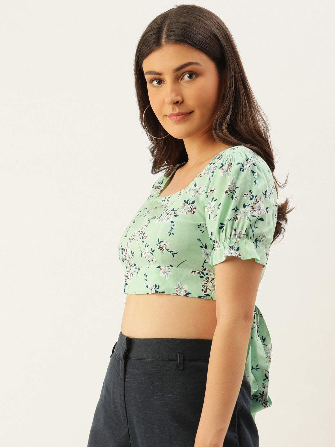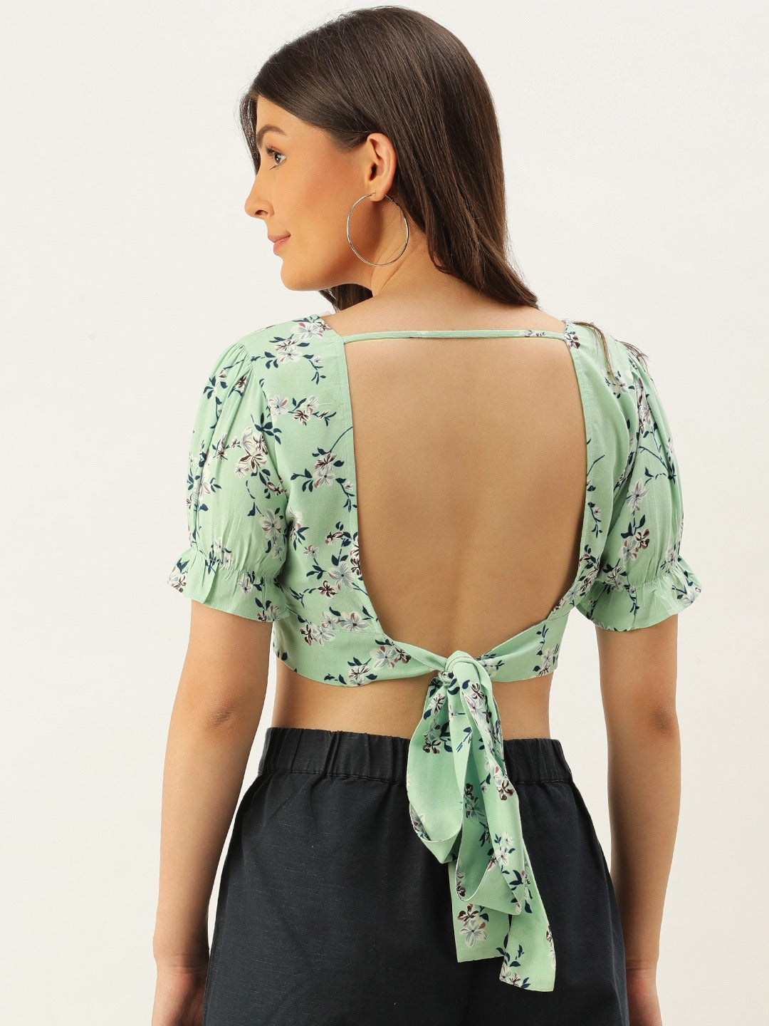 Berrylush Women Green Floral Printed Open Back Crop Top
