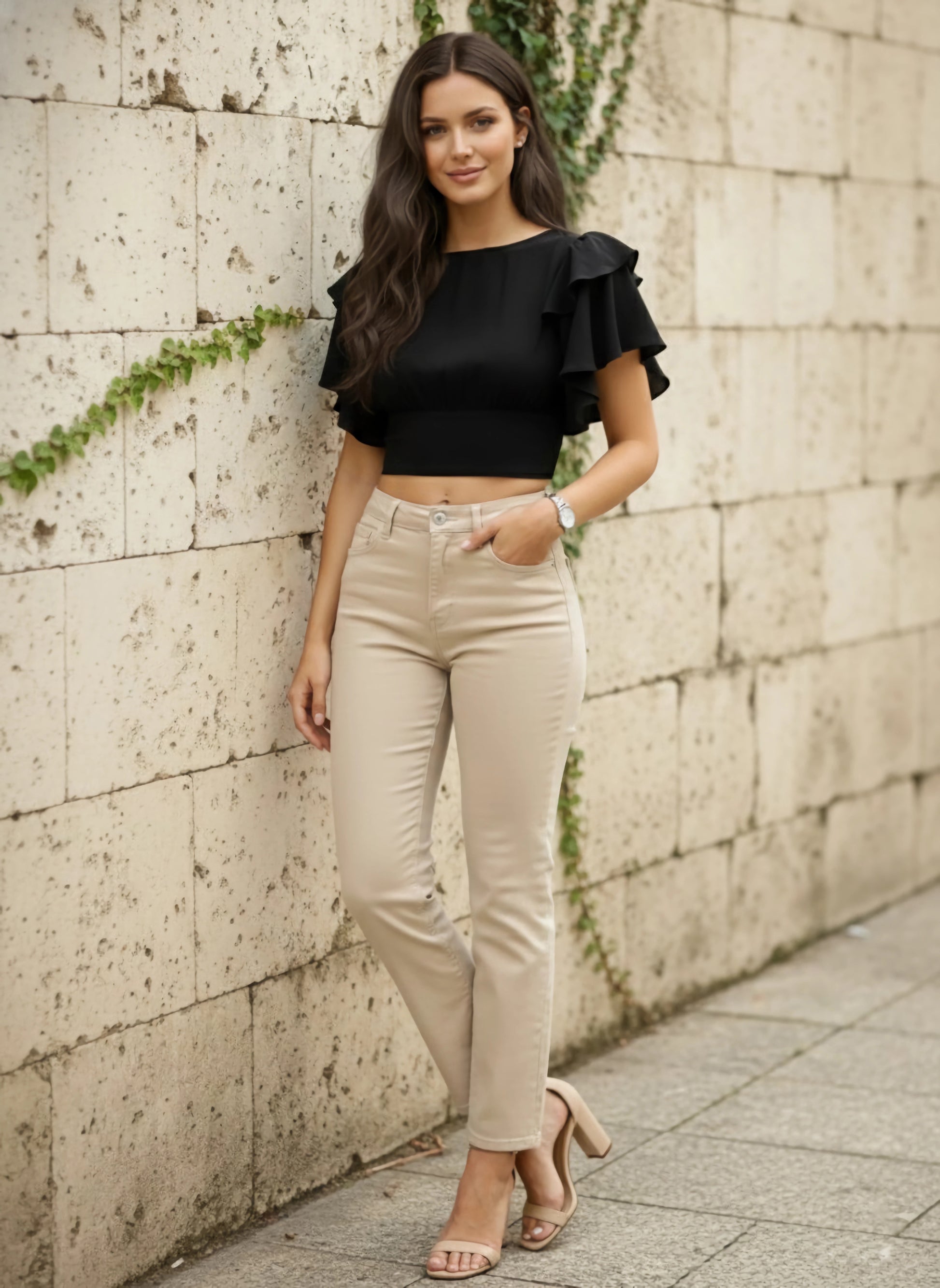 This spring party night will get the ultimate sassy styling with this Solid Black Round-Neck Open-Back Ruffled Blouson Crop Top from Berrylush. The arms speak of a faddish free-flowing aura with the existence of flutter design. The torso appears more alluring with the round neckline and the overall silhouette gets a fascinating outline. The black colour adds up a strong personality to your top and the back looks exquisite with the deep gorge and the back tie-up knot. The banded waistline retains the shape of your proportions. The lightweight polyester fabric offers comfort all day long. Match this cropped top with high waist white jeans and high-heeled pumps to complete your look. Dress for your summer night outfits and look outstanding with Berrylush.