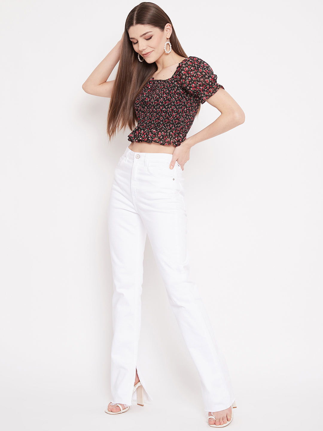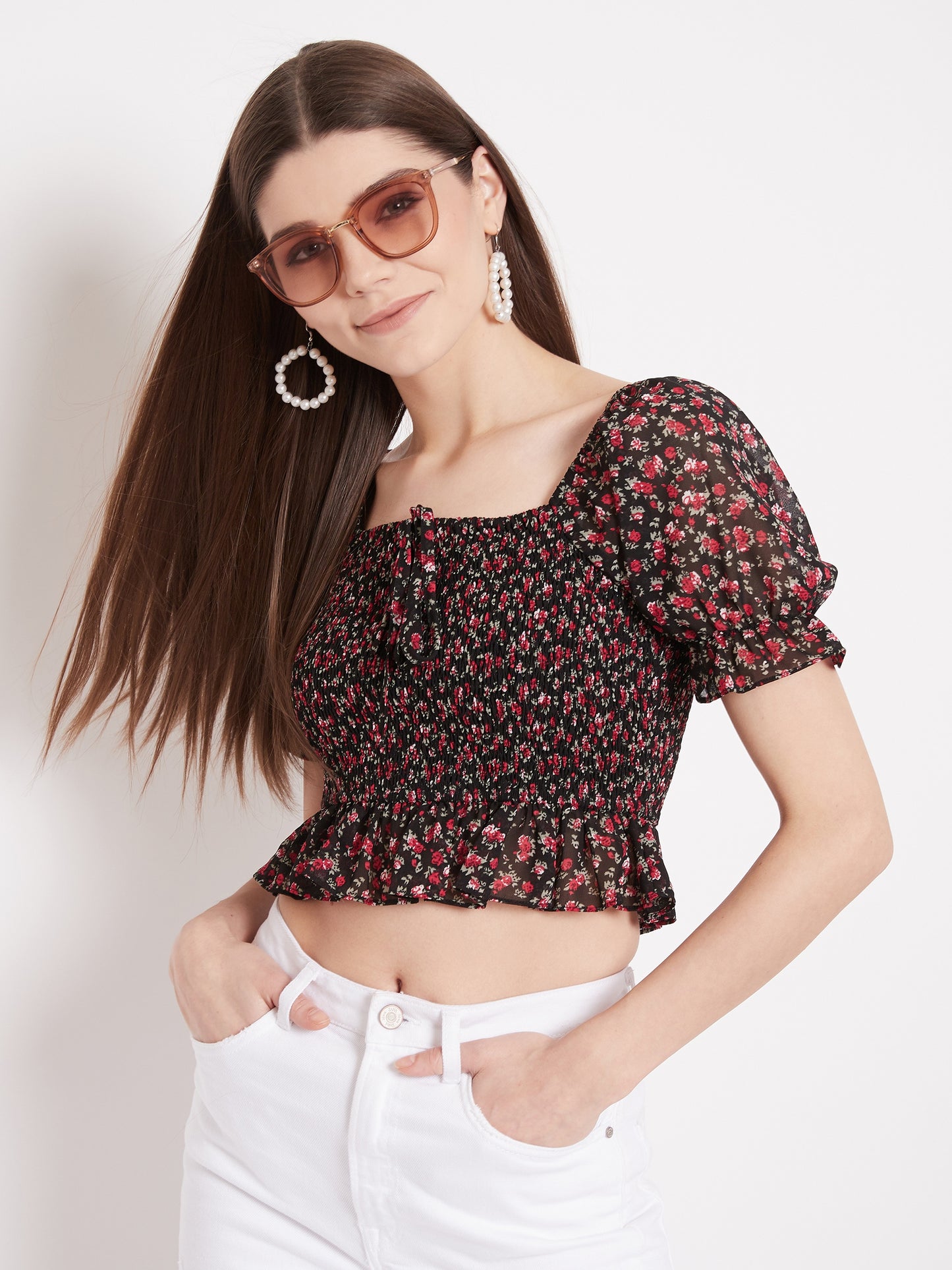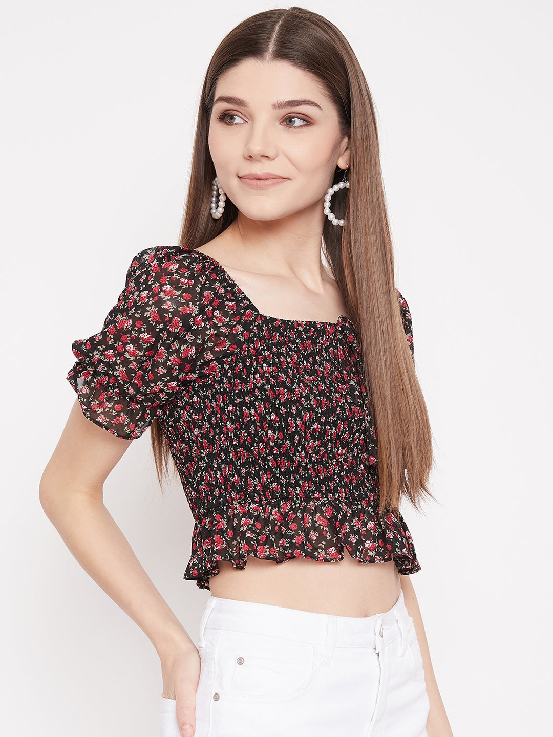 Searching for a new crop top to jazz up your partywear collection? You're in luck! This Black Floral Print Smocked Crop Top by Berrylush is perfect for looking and feeling good. The floral print is paired with a smocked bodice and puffed short sleeves for a unique look. Polyester crepe fabric with a woven weave assists in keeping you comfortable even in warm weather conditions. Includes a square neckline, black color, and cropped-length design for a gorgeous appearance. In addition to being perfect for a night out, this piece looks great with a pair of leggings and some slides!