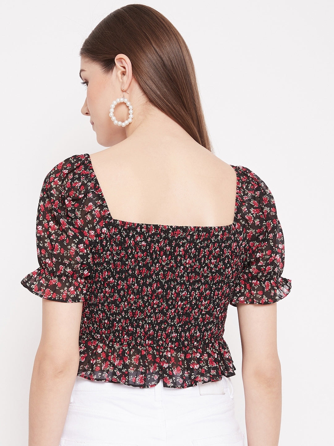 Berrylush Women Black Floral Print Smocked Crop Top