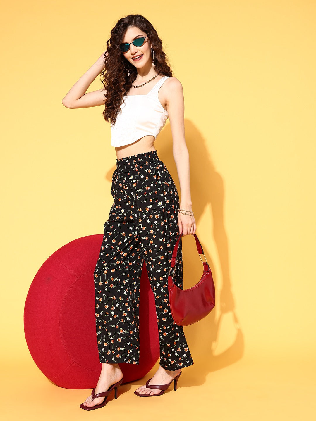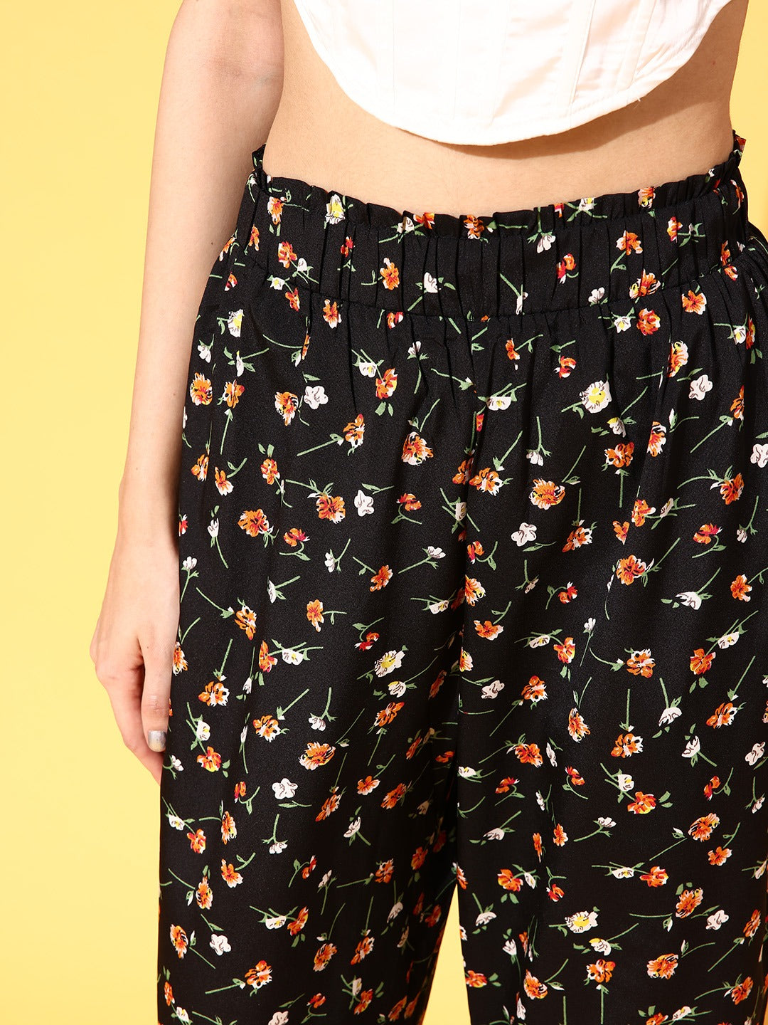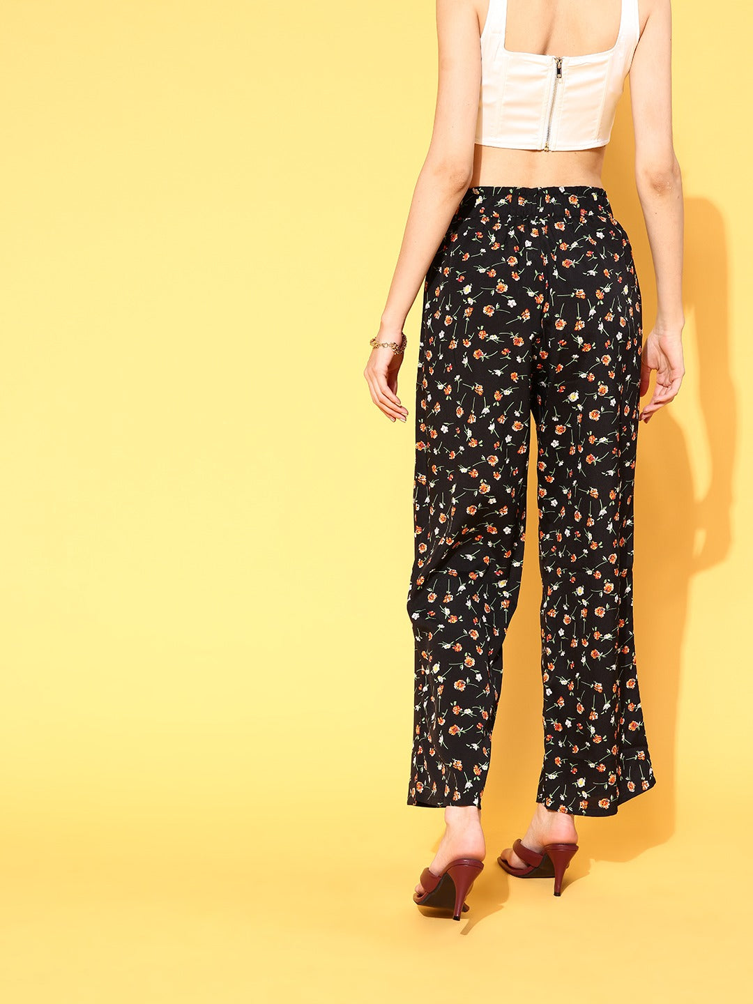 Berrylush Women Black Floral Printed Relaxed Loose Fit High-Rise Pleated Trousers