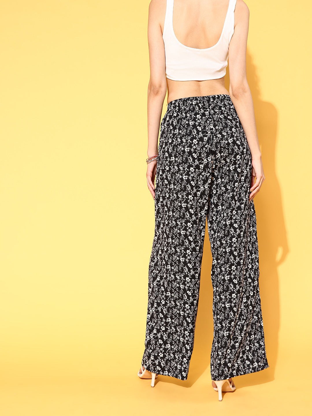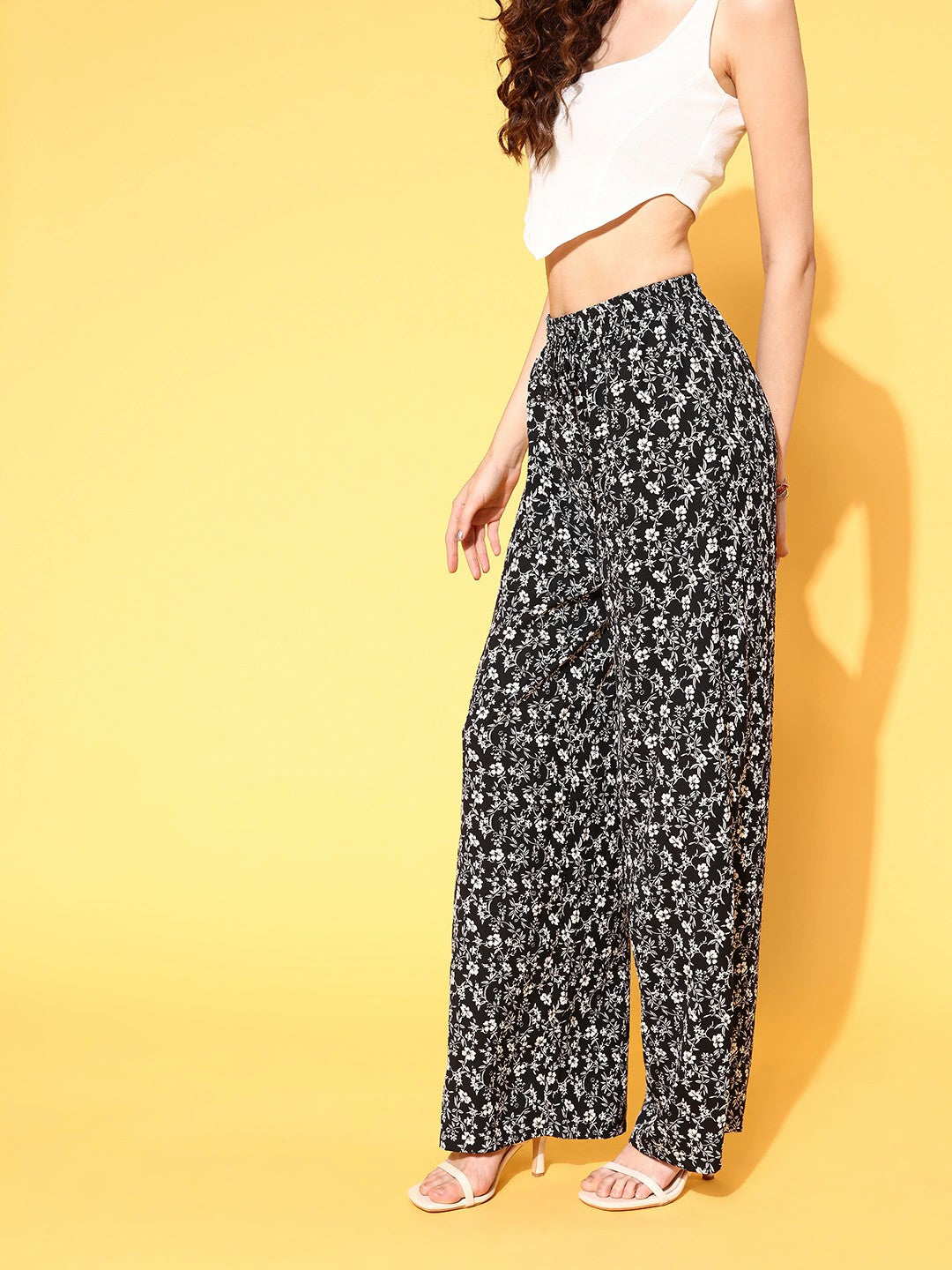 Berrylush Women Black & White Floral Printed High-Rise Waist Wide Leg Flared Trousers