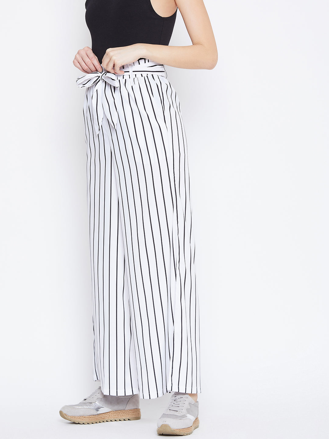 Berrylush Women White & Black Striped Pattern Waist Tie-Up Mid-Rise Trousers