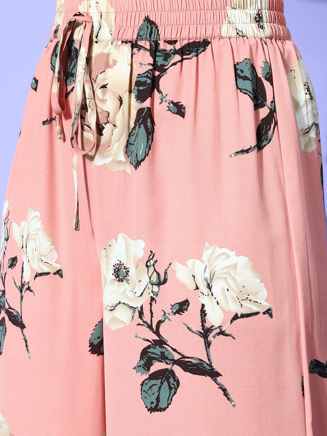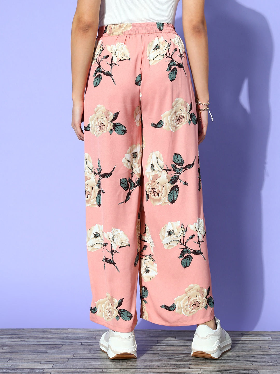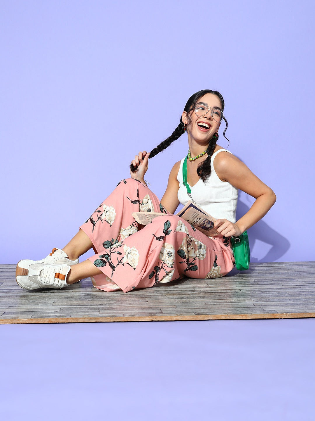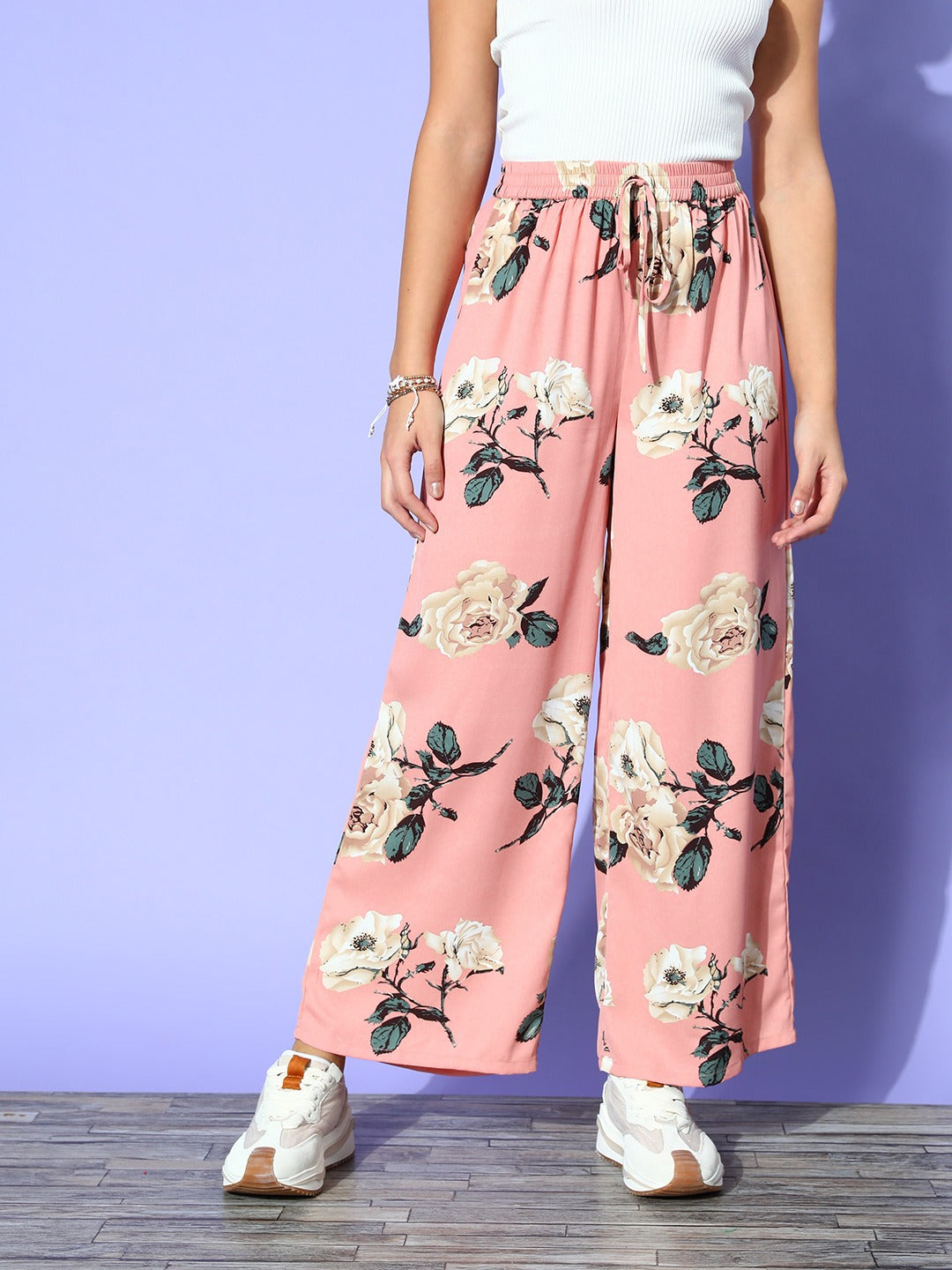 Berrylush Women Pink & White Floral Printed High-Rise Waist Wide-Leg Regular Trousers