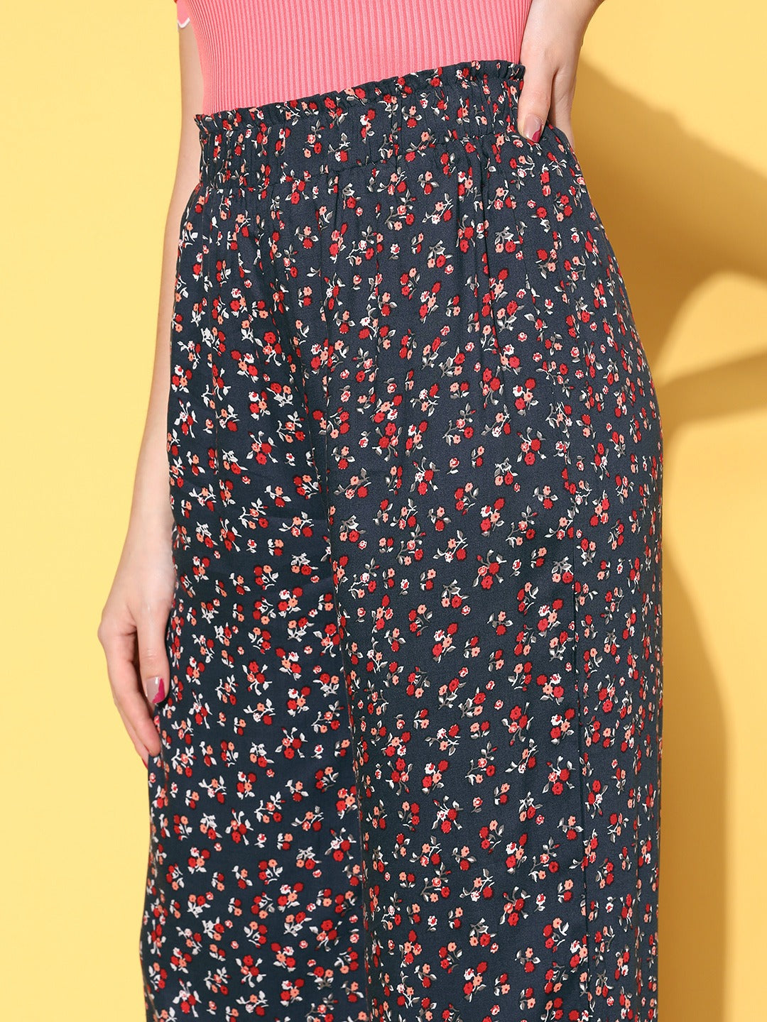 Berrylush Women Navy Blue & Red Floral Printed High-Rise Elastic Waist Pleated Trousers