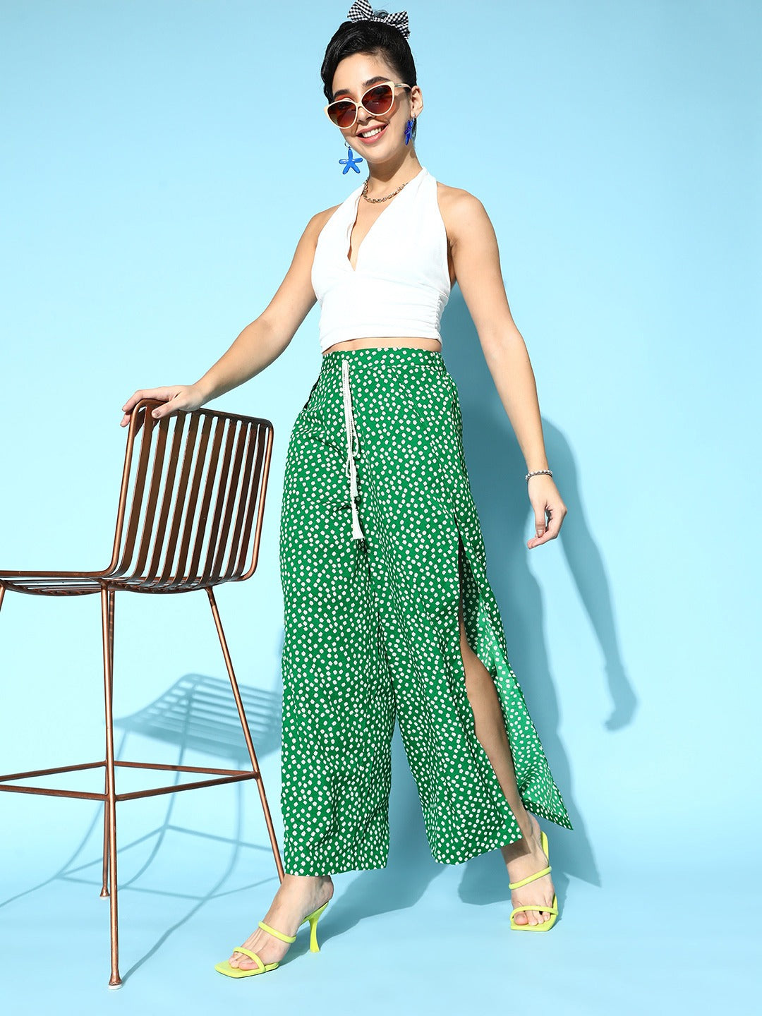 Enhance the charm of your bottom-wear collection with some flattering style pieces just like these glamorous Green and White Floral Printed Side Slit Tapered Fit Regular Trousers from Berrylush. Rendered from premium quality polyester material that gives these trousers a delicate touch against your skin with unlimited breathability and uninterrupted comfort. Fashioned with plain features that lend these trousers a dash of contemporary style with a modest and chic appearance. The regular length makes these trousers appear sophisticated with proper coverage to your legs along with hassle-free movements. Team it with a fitted top, a pair of block heels, floral stud earnings, and a sassy side bag for an enchanting look to attend outdoor activities.