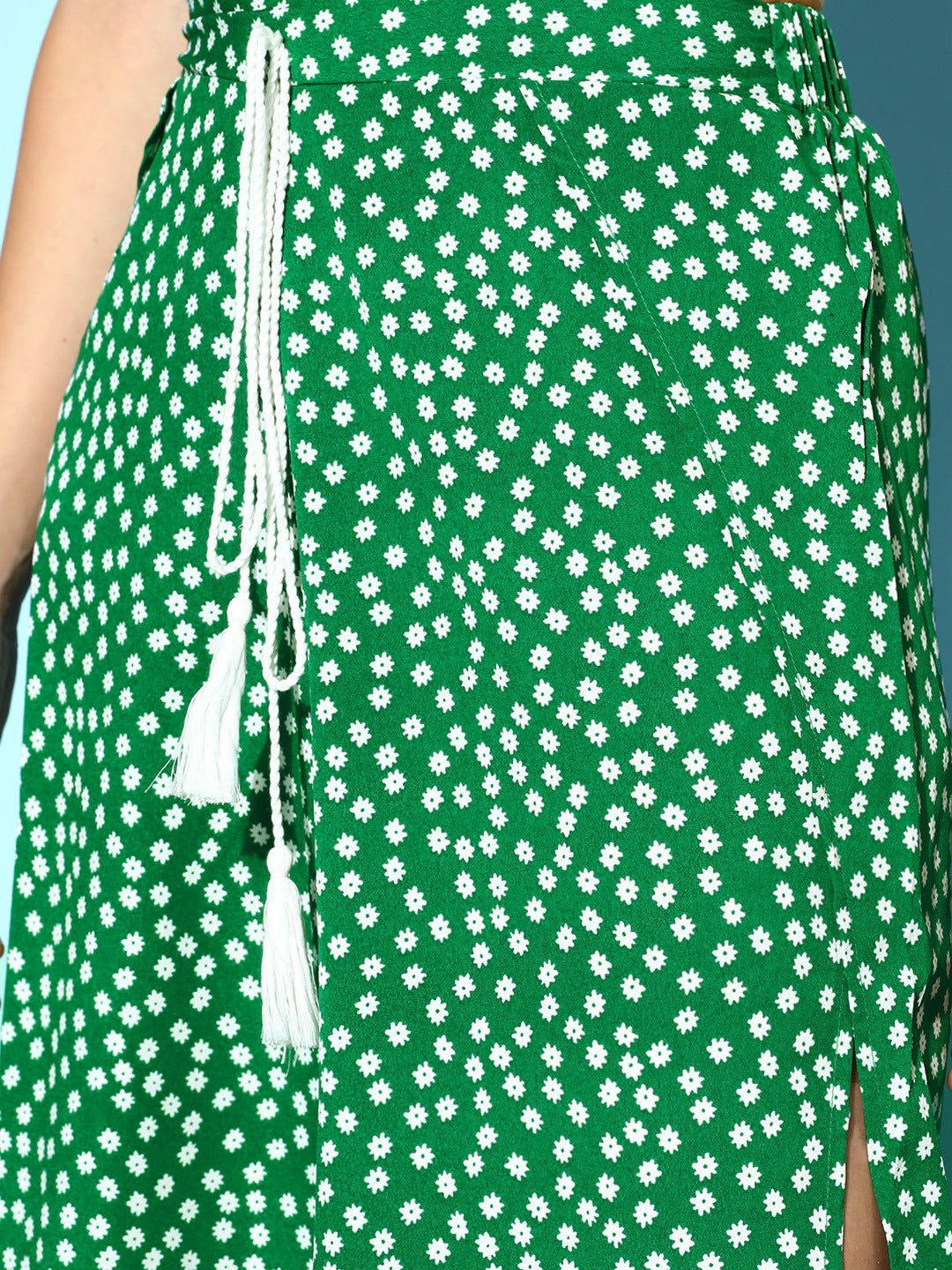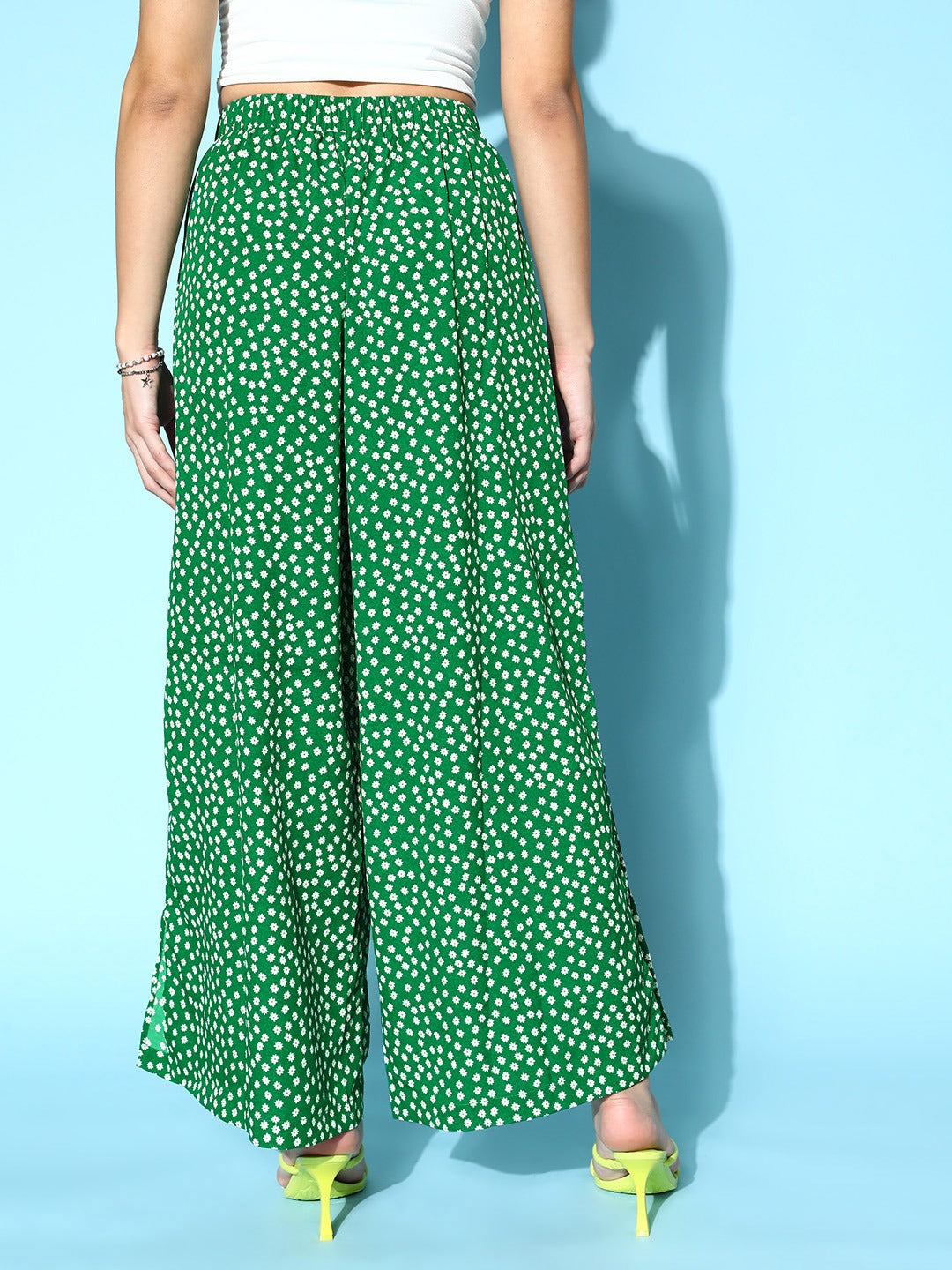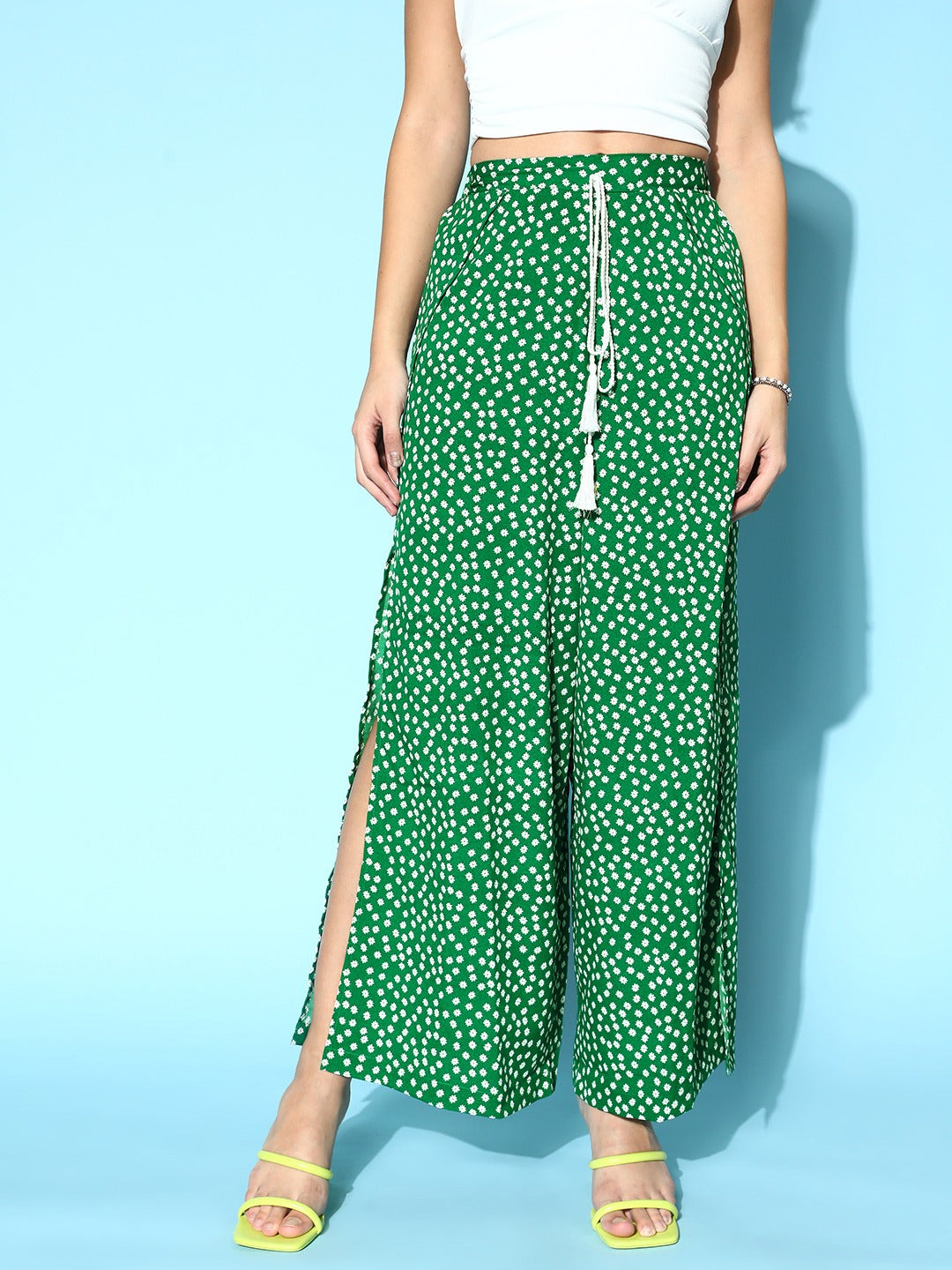 Berrylush Women Green & White Floral Printed Mid-Rise Tie-Up Waist Side-Slit Tapered Regular Trousers