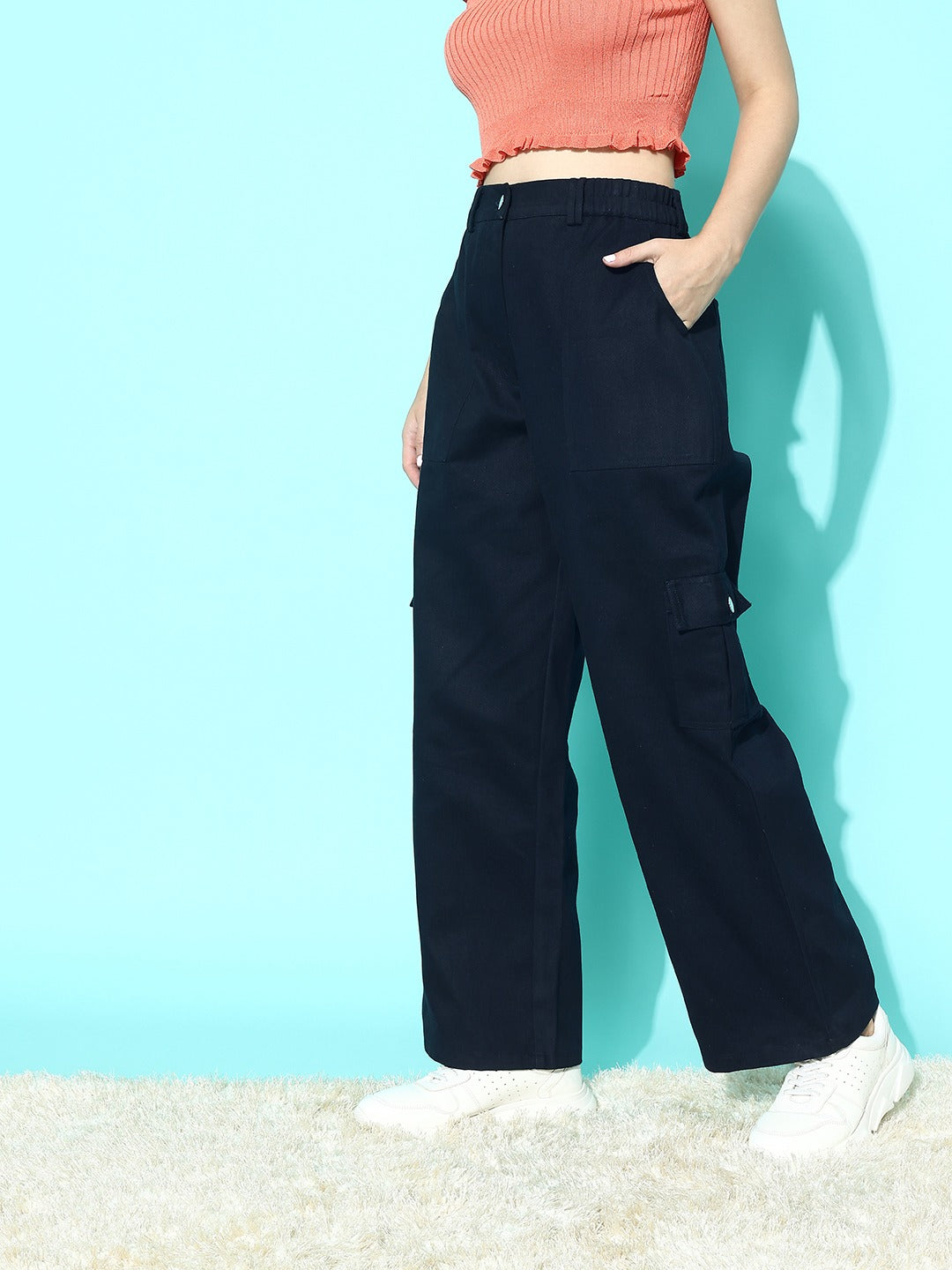 If your fashion preference lies within relaxing yet chic style, then it's time to invest in these Solid Navy Blue High-Rise Waist Flap Six-Pocket Cotton Regular Cargo Jeans from Berrylush. Adorned with a high-rise waist, these cargo jeans have a universally flattering style while gracefully hiding your stomach. Structured with a regular fit to offer a breathable silhouette and refined look. Rendered from the finest cotton fabric, these cargo jeans are lightweight with a sweat-wicking feature that makes them a perfect option for tracking days on sunny days. Wear these cargo jeans with a black crop top, cool black sneakers, and a trendy waist bag for a fashion-focused look.