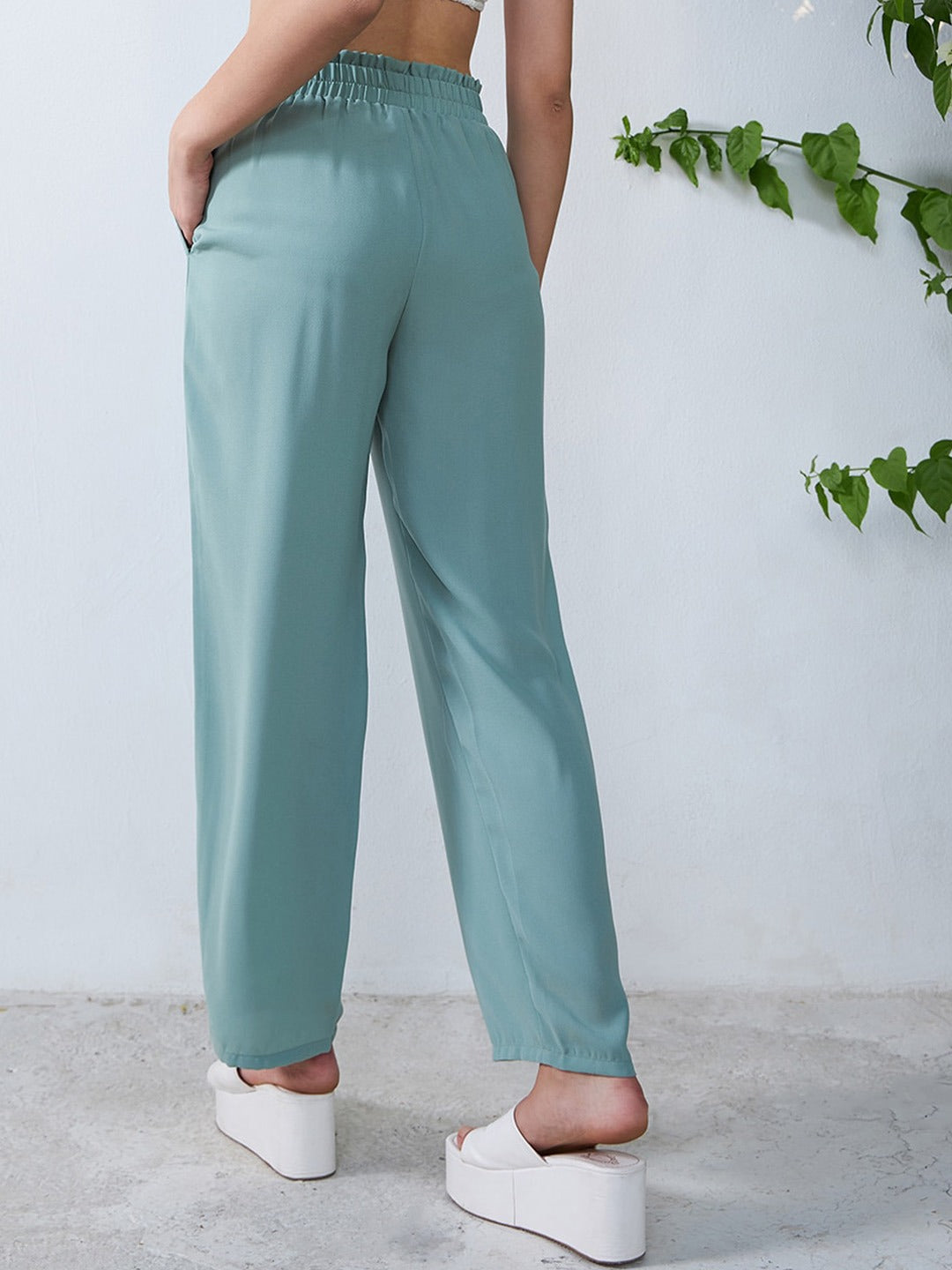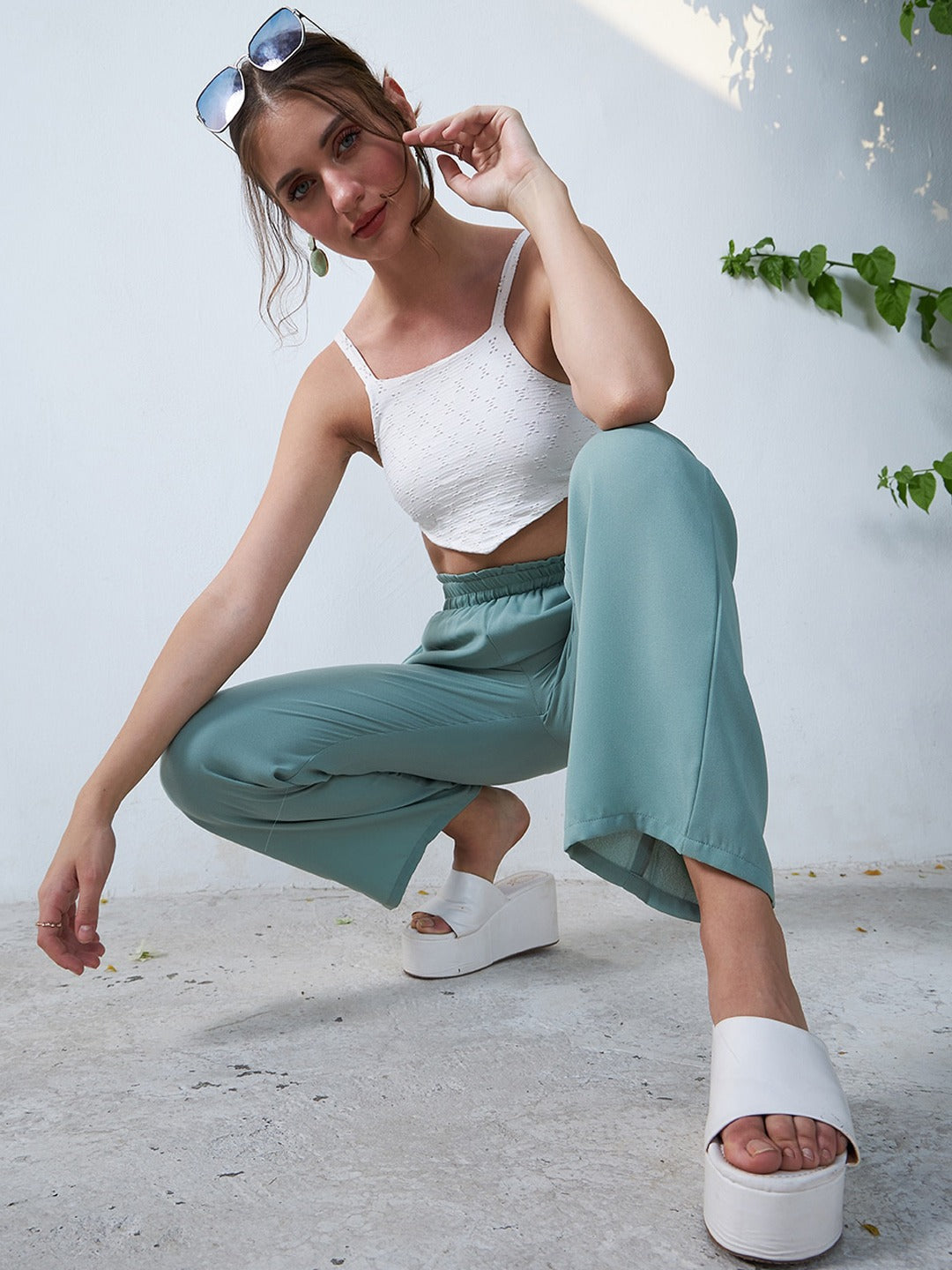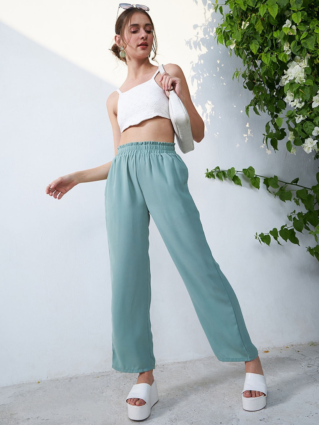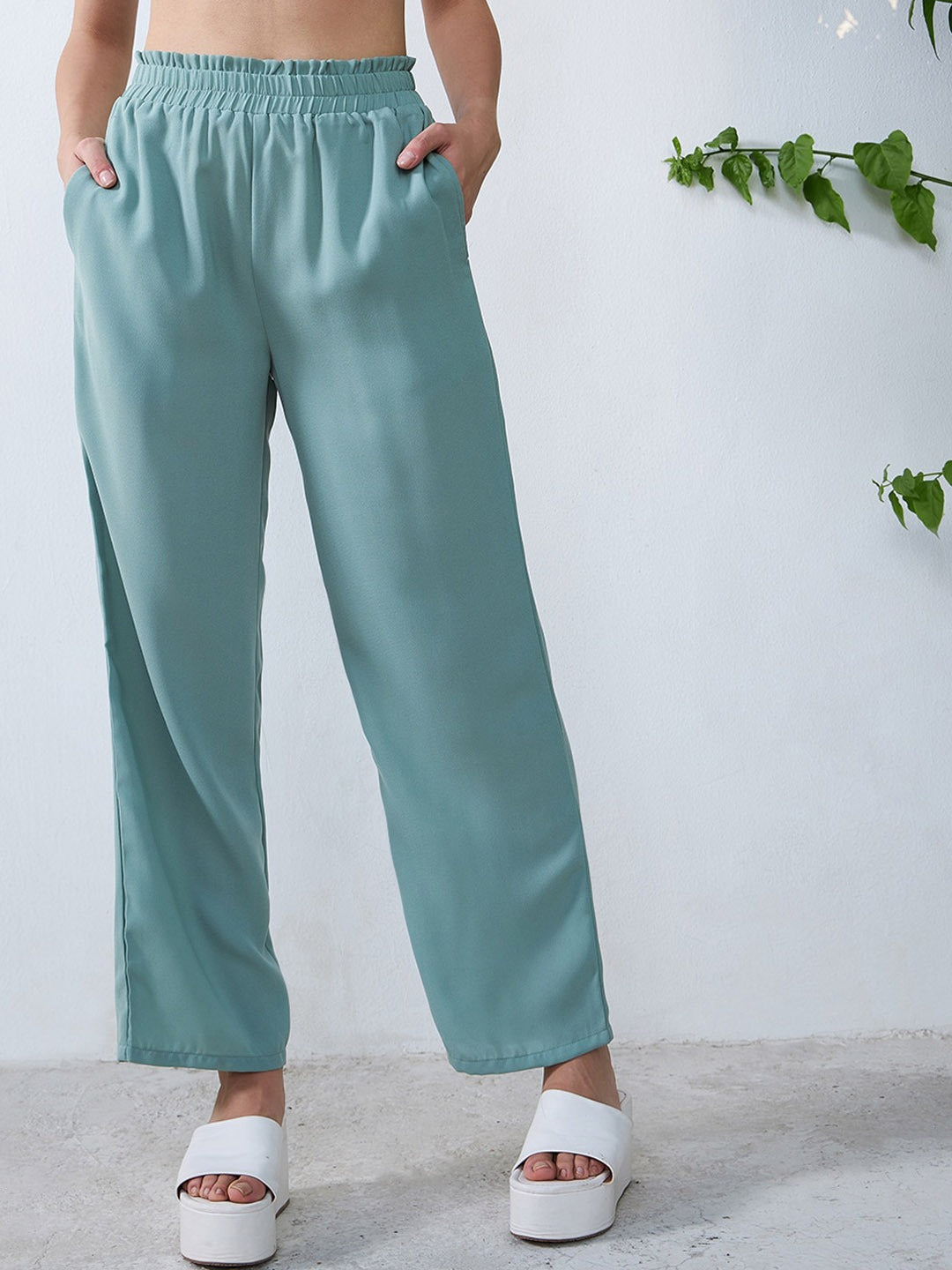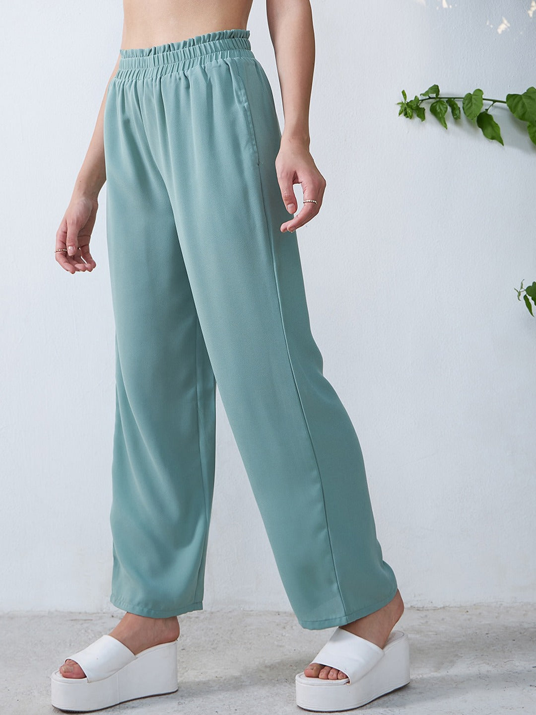 Berrylush Women Solid Green High-Rise Waist Loose-Fit Slip-On Straight Leg Regular Trousers