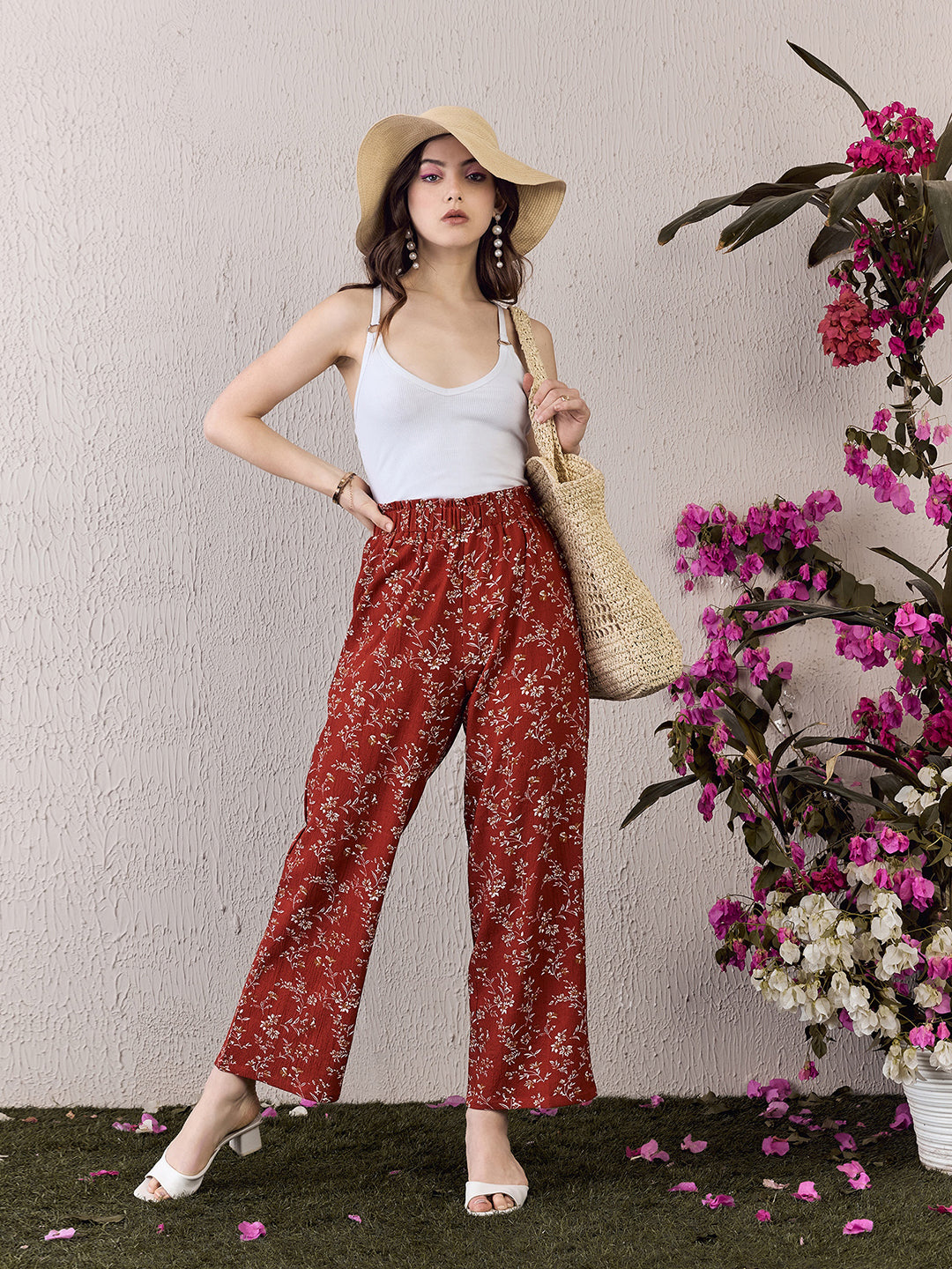 Experience the perfect blend of comfort and style with Berrylush's Floral Printed Parallel Trousers. These high-rise trousers come in a vivid red and white floral print that adds a fresh vibe to your wardrobe. Crafted from soft, woven polyester fabric, they ensure day-long comfort with their elastic waistband and easy slip-on design. The pleated surface styling brings an elegant texture that enhances the overall allure while maintaining an opaque finish for confidence throughout wear. Ideal for casual outings, these trousers pair effortlessly with your favourite top for a chic, effortless look.