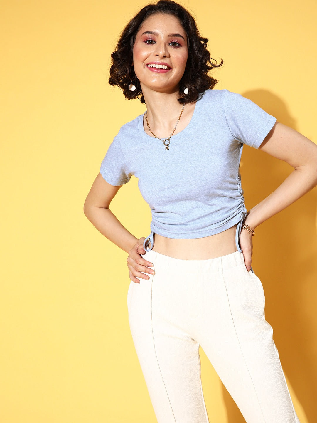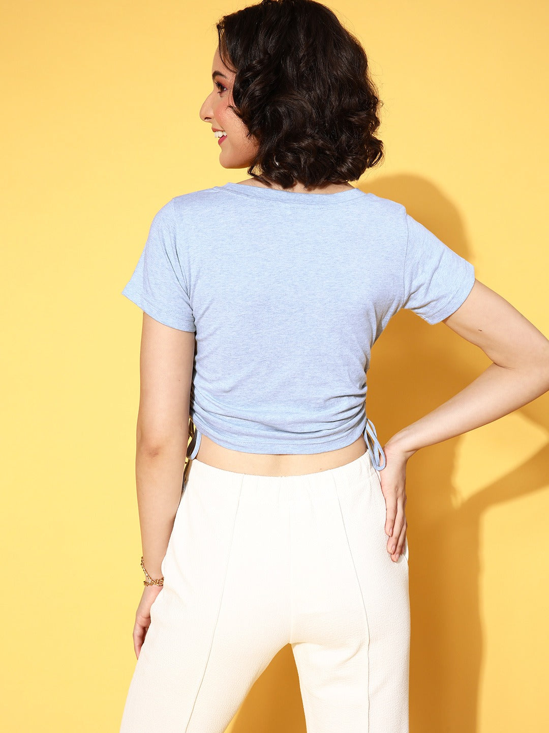 Berrylush Women Solid Blue Round Neck Side Tie-Up Cotton Fitted Crop Top