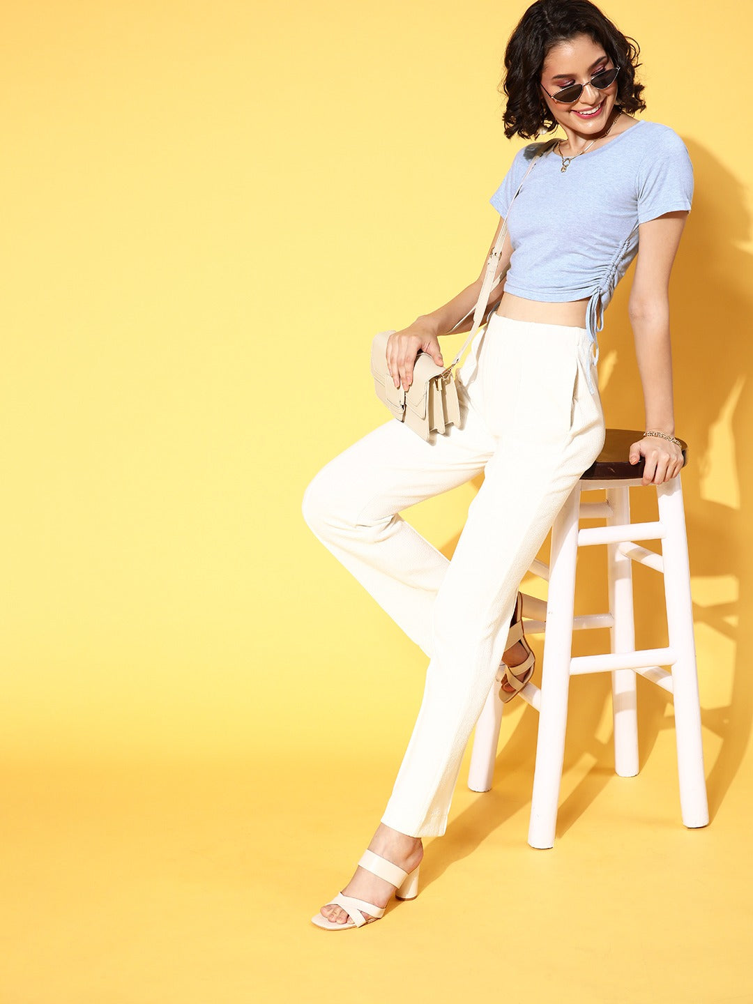 Keep your style light, refreshing and fetch in the latest fashion with this adorable Solid Blue Round Neck Side Tie-Up Cotton Fitted Crop Top from Berrylush. This top will keep your wardrobe up-to-date with the trend as it comes in crop length which makes your look appear fashionable and sexy. Designed with fitted styling that gives you contouring and body-hugging silhouette to elegantly show off your curves. Also, the tie-up surface styling adjoins a decorative finish to this top along with ruched detailing. You can wear this crop top with white wide-leg trousers, a pair of classy high-heels, and a sassy purse to get a stunning look.