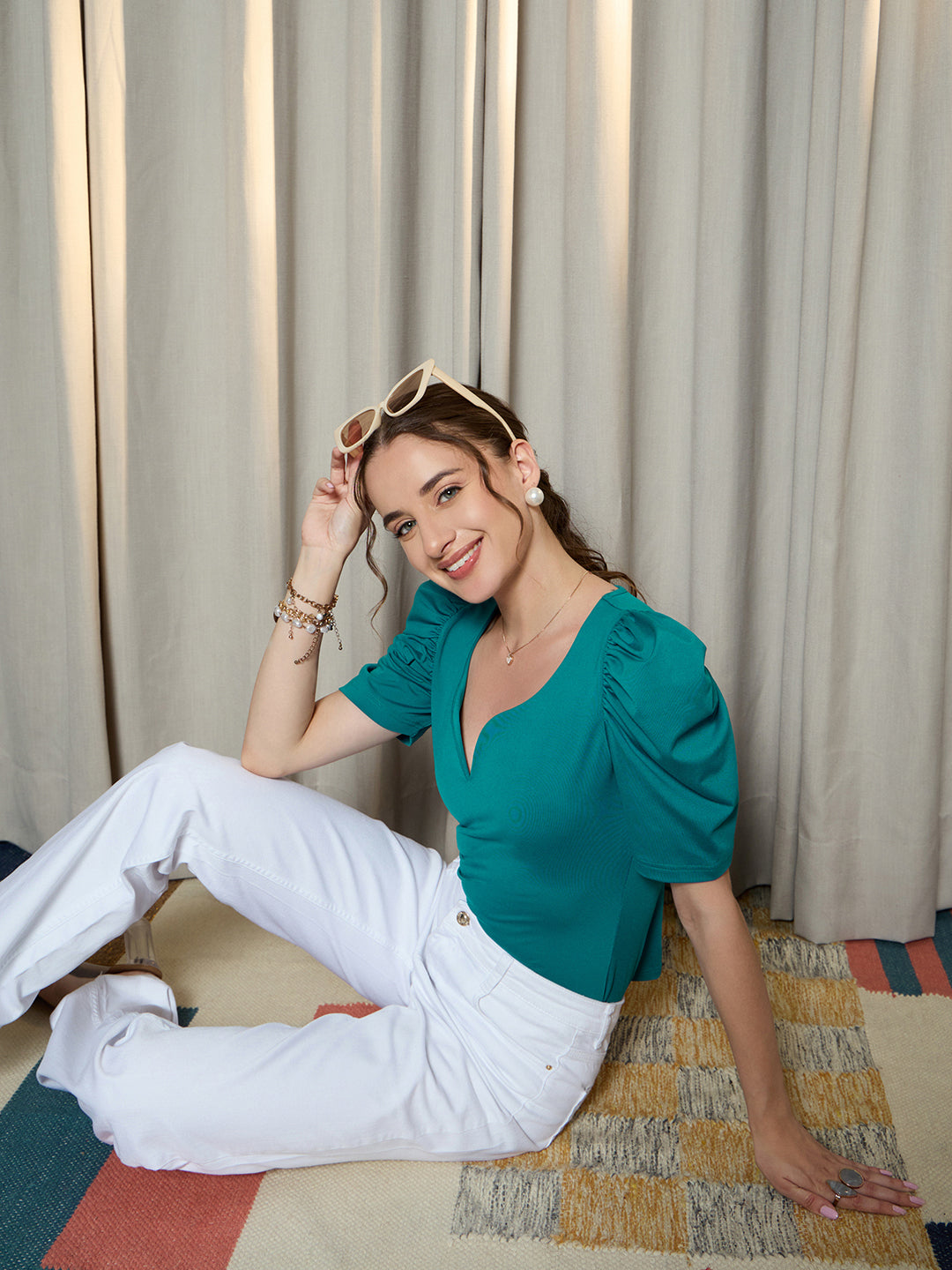 Berrylush Women Blue Solid Round Neck Puff Sleeve Regular Tshirt