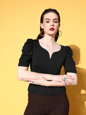 Keep your casual look on point with voguish fashion essence by wearing this captivating Solid Black Sweetheart Neck Puff Sleeve Cotton Pleated Regular Top from Berrylush. Presenting a classic mixture of royal black shade with a solid pattern that gives this top a tint of versatility and a passionate aura. Designed in a regular length that makes this top appears smart and sophisticated with proper coverage of your upper body. Also, the knitted detailing lends this top an elastic nature with an excellent shape retention feature. You can attend any formal and casual events by partnering up this black solid top with a pair of parallel pants, black block heels, minimalistic diamond jewellery, and a matching side bag.