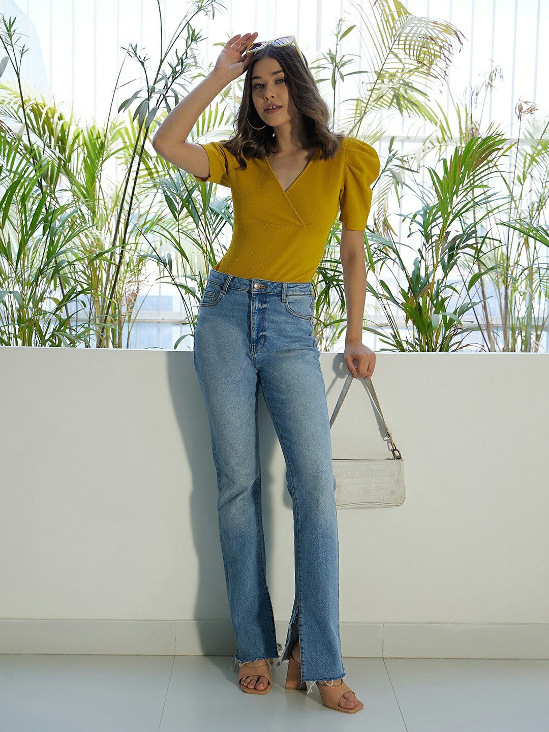 Push your fashion lifestyle to a whole new level with this gorgeous Solid Yellow V-Neck Puff Sleeves Slim Fit Wrap Knitted Regular T-Shirt designed by Berrylush. Spotlighting a V-neck design that gives a wider space and alluring appeal to your neckline and shoulders. Spun from polyester fabric that supports odour-free features along with moisture-wicking properties. Moreover, the short-puffed sleeves help to keep your arms warm and cosy. Partner up this stylish t-shirt with a checked mini skirt, minimalistic silver jewellery, and white sneakers to get a fashion-flattering appearance.