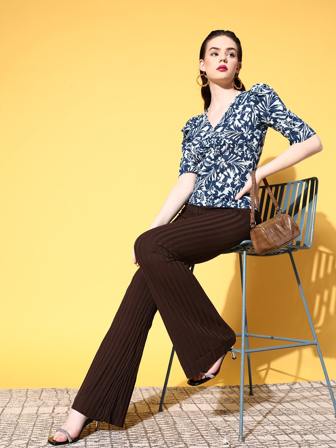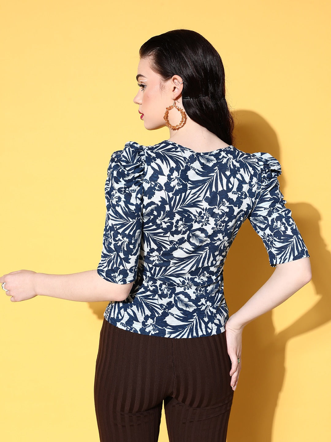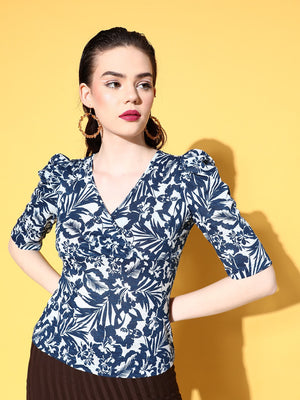 Berrylush Women Navy Blue & White Floral Printed V-Neck Cotton Pleated Regular Wrap Top