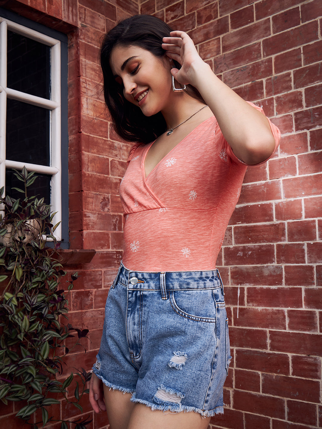 Unwrap the gift of timeless beauty with an enchanting appeal by wearing this Pink & White Floral Printed V-Neck Cotton Pleated Regular Wrap Top from Berrylush. Crafted with high-quality cotton fabric to let you stay comfortable and relaxed while you enjoy the summer breeze. The puff style of its sleeves adds a charming flair and the V-neckline gives this top a gorgeous look. The fantastic duo of pink and white shades offers this top an attractive appeal and the overall floral print creates a stylish look. Partner up this wrap top with a pair of pump heels, high-rise jeans, minimalistic silver jewellery, and a sling bag to create a bewitching glance.