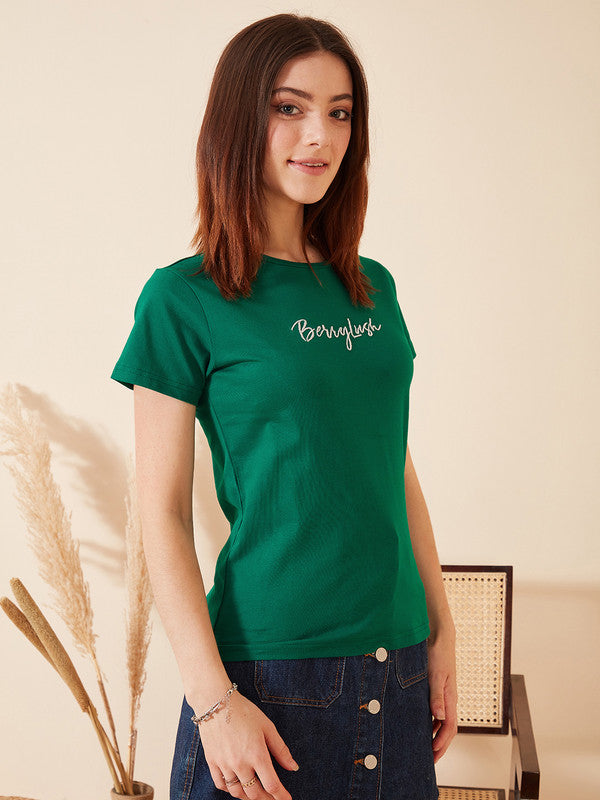 Berrylush Women Solid Green Round Neck Short Sleeves Logo Embroidered Regular T-Shirt