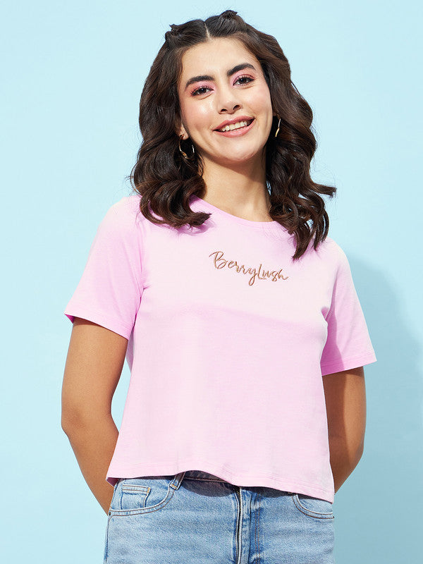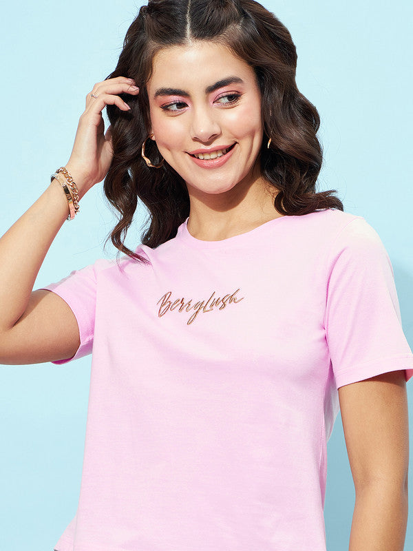 Berrylush Women Solid Pink Round Neck Front Brand Logo Short Sleeves Knitted Regular T-Shirt