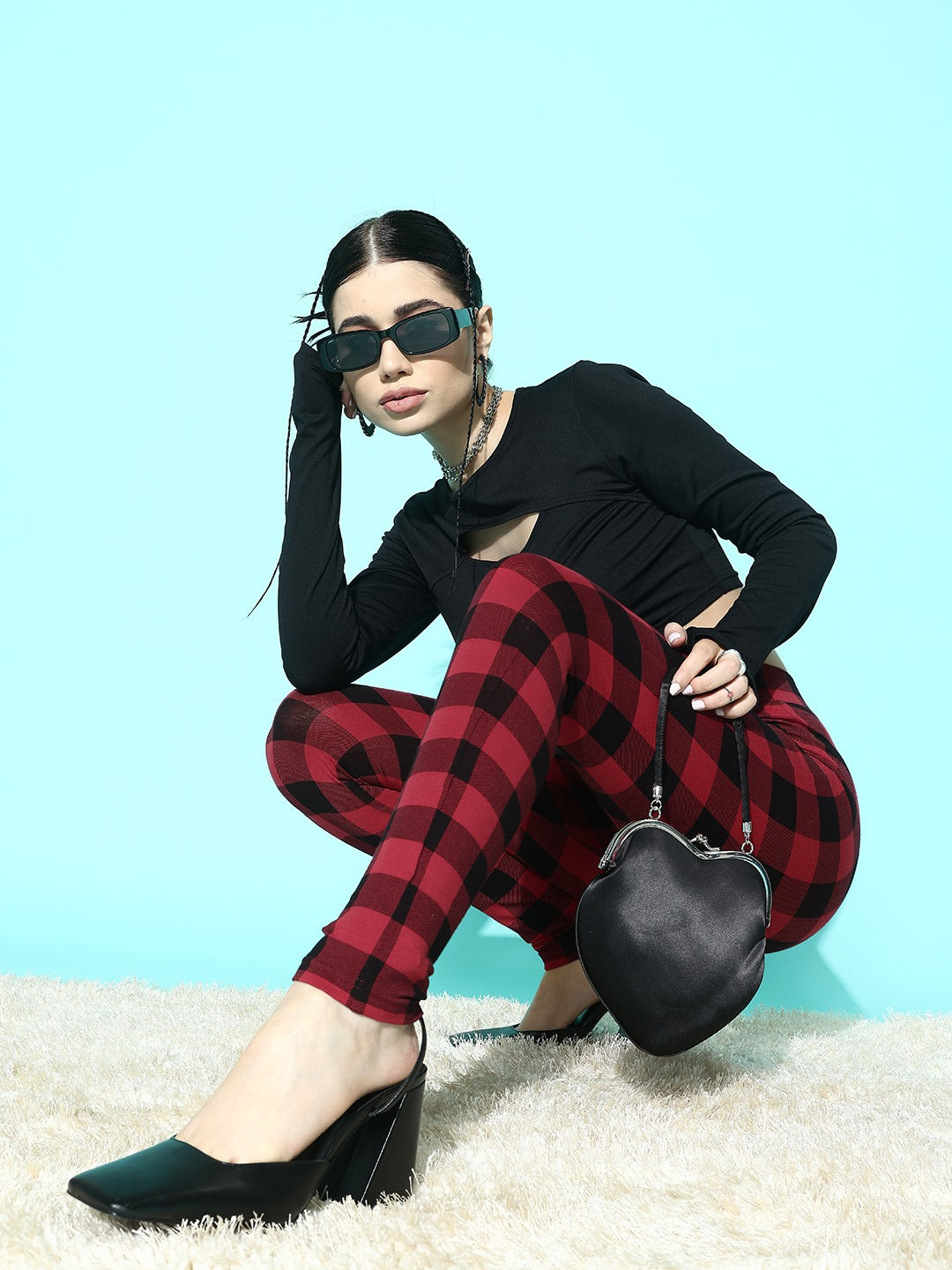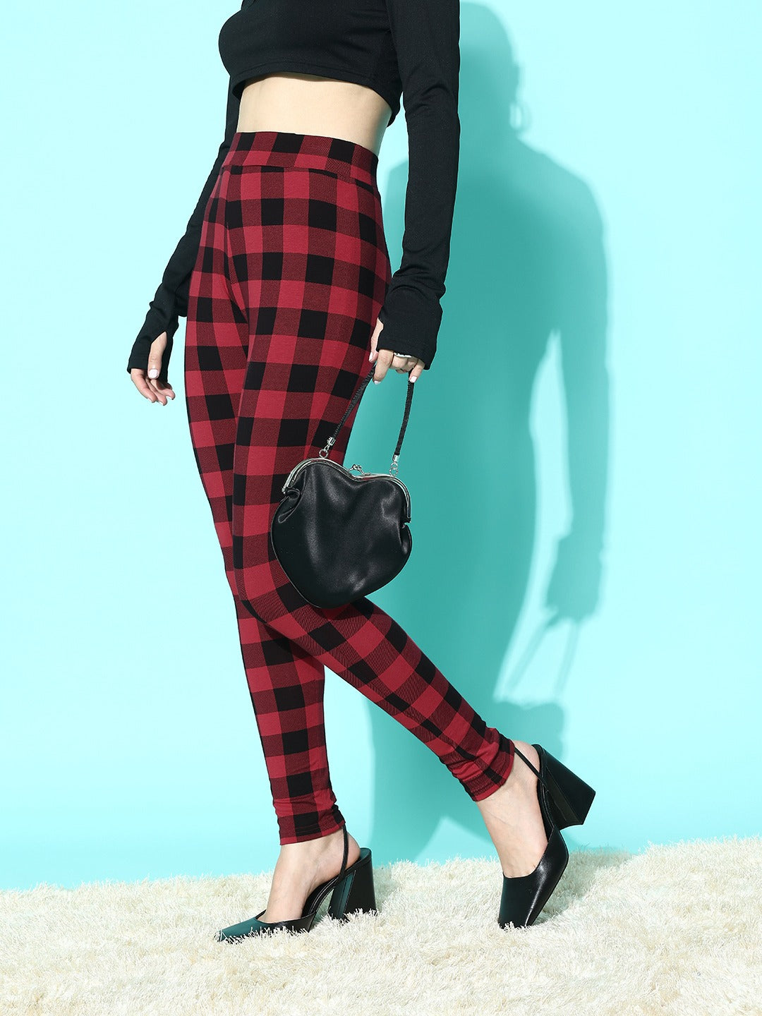 Berrylush Women Red & Black Check Printed Super Stretchy & High Waisted Sports Tights