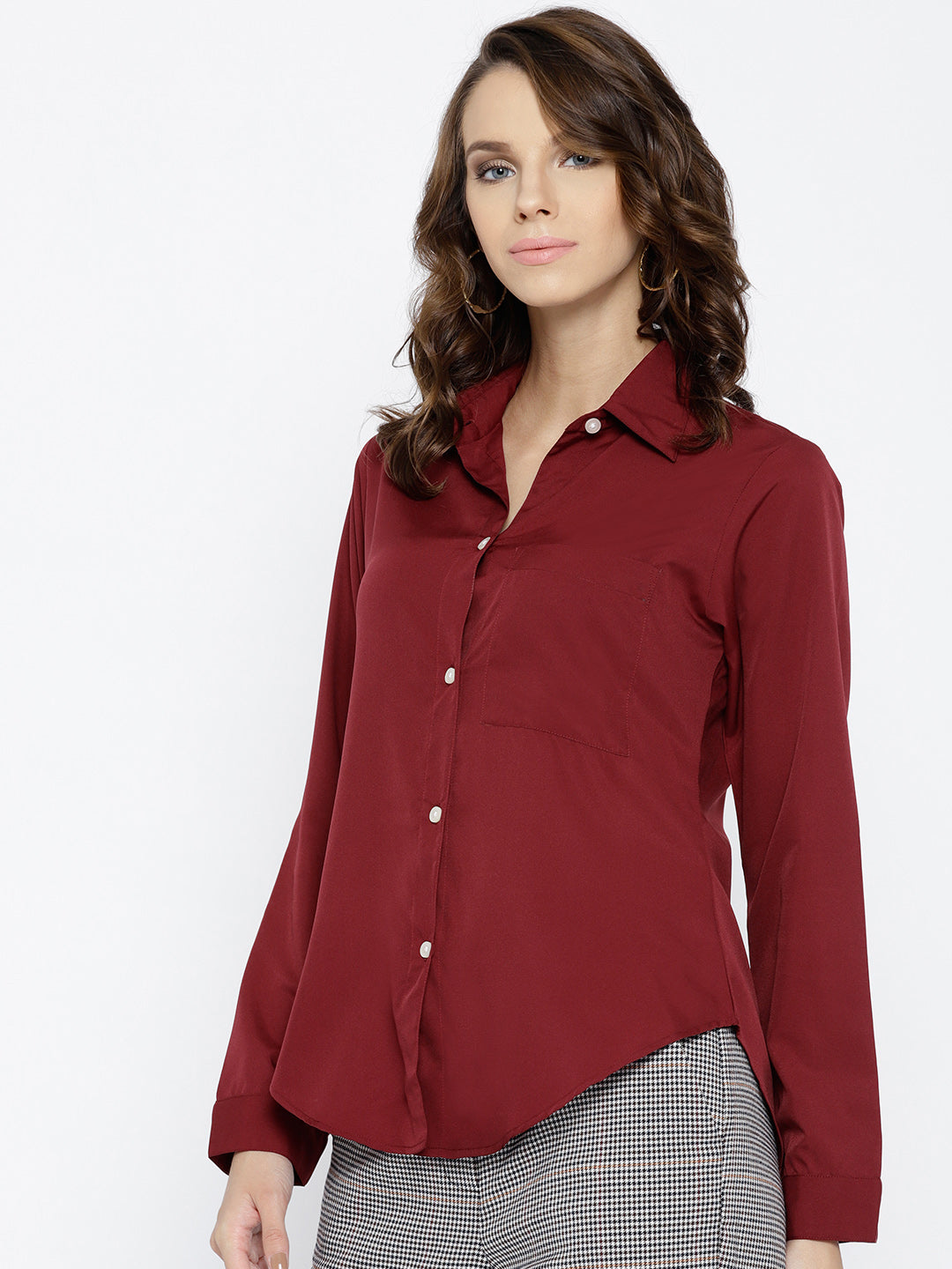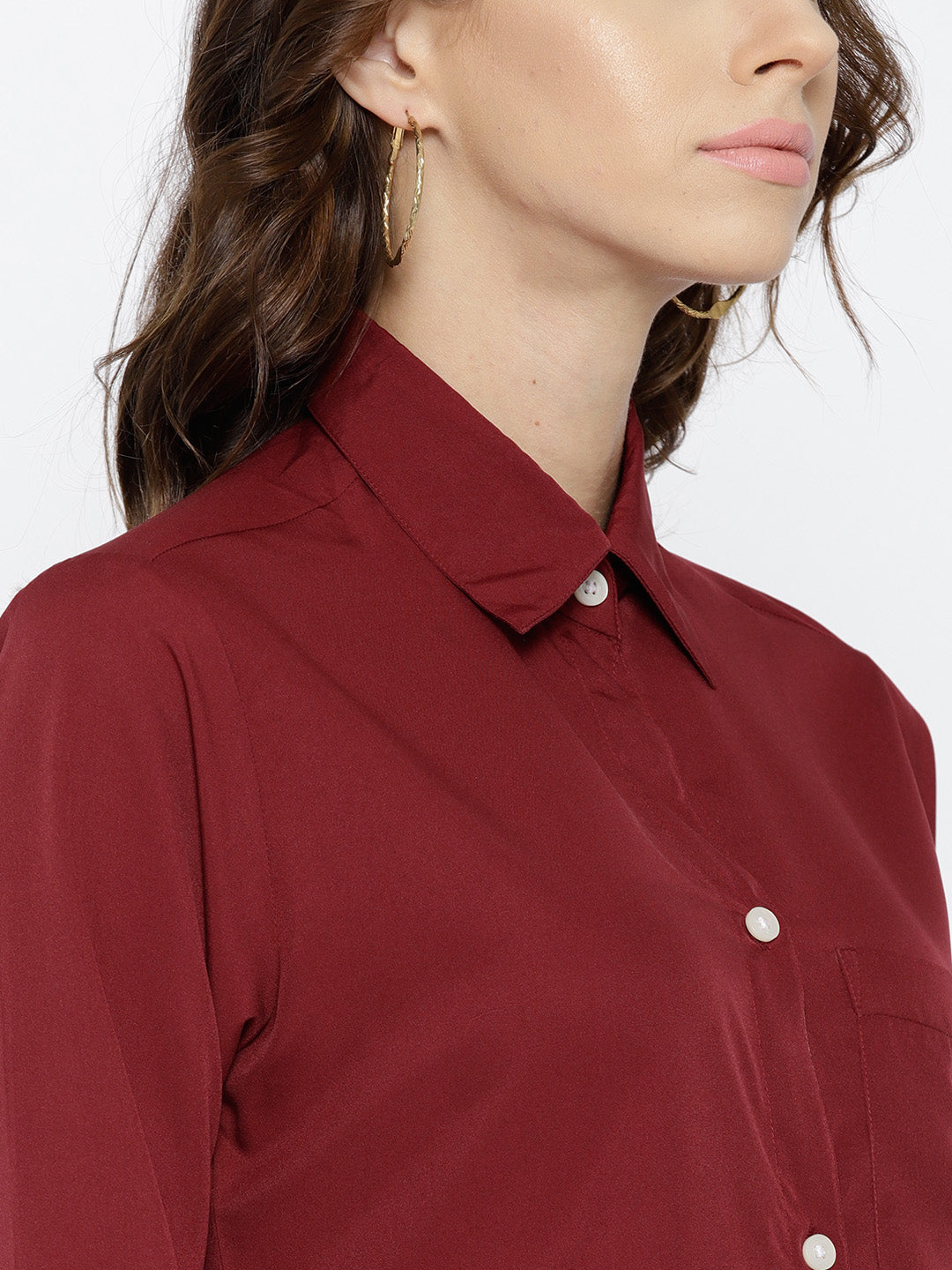 Berrylush Women Solid Maroon Spread Collar Neck Button Placket Curved Regular Shirt