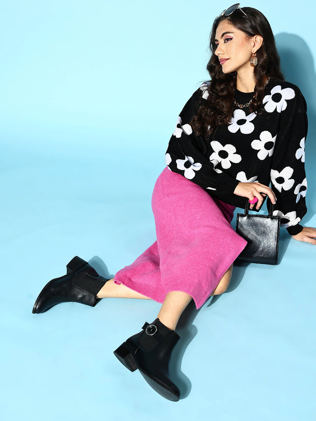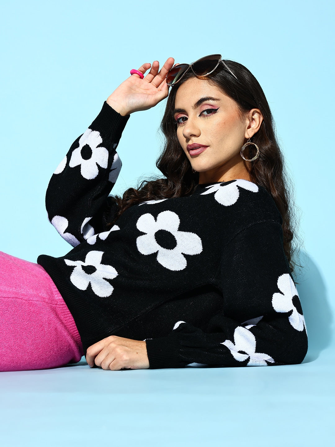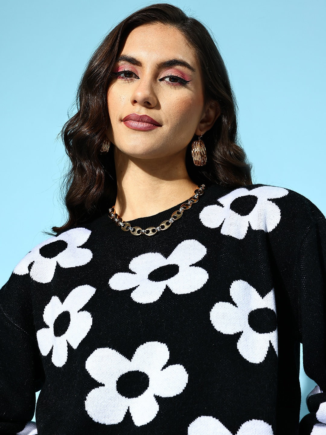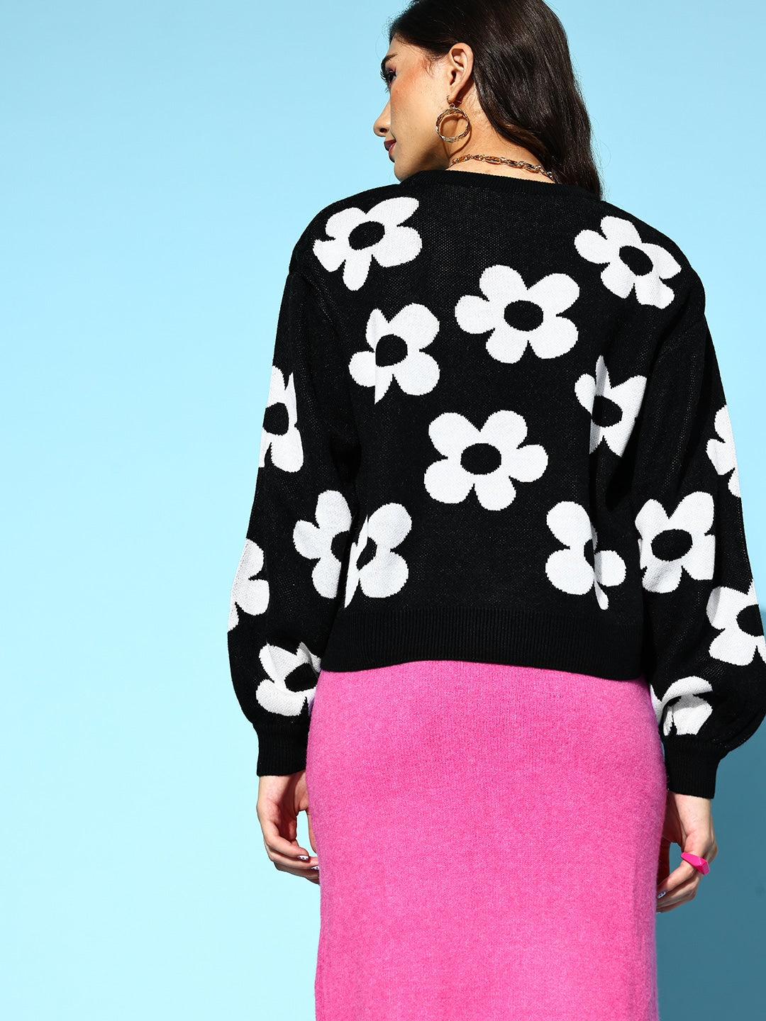 Strive for trendy options to upgrade your winter wear collection, then look no further by selecting this bedazzling Black and White Floral Print Round Neck Ribbed Hem Regular Pullover designed by Berrylush. Highlight the cinematic combination of black and white shade that gives this pullover a voguish appearance while reflecting your bold personality. Framed in a ribbed hem profile that lends this pullover a contouring yet comfortable silhouette to elegantly outshine your curves. In addition, the regular length injects practicality to this pullover with suitable coverage to your upper body to keep the cold out. Wear this pullover with a midi skirt, ankle-length boots, floral hoop earrings, and a cute pink handbag to create a fabulous look.