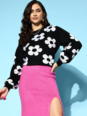 Berrylush Women Black & White Floral Print Round Neck Polyester Ribbed Hem Regular Pullover