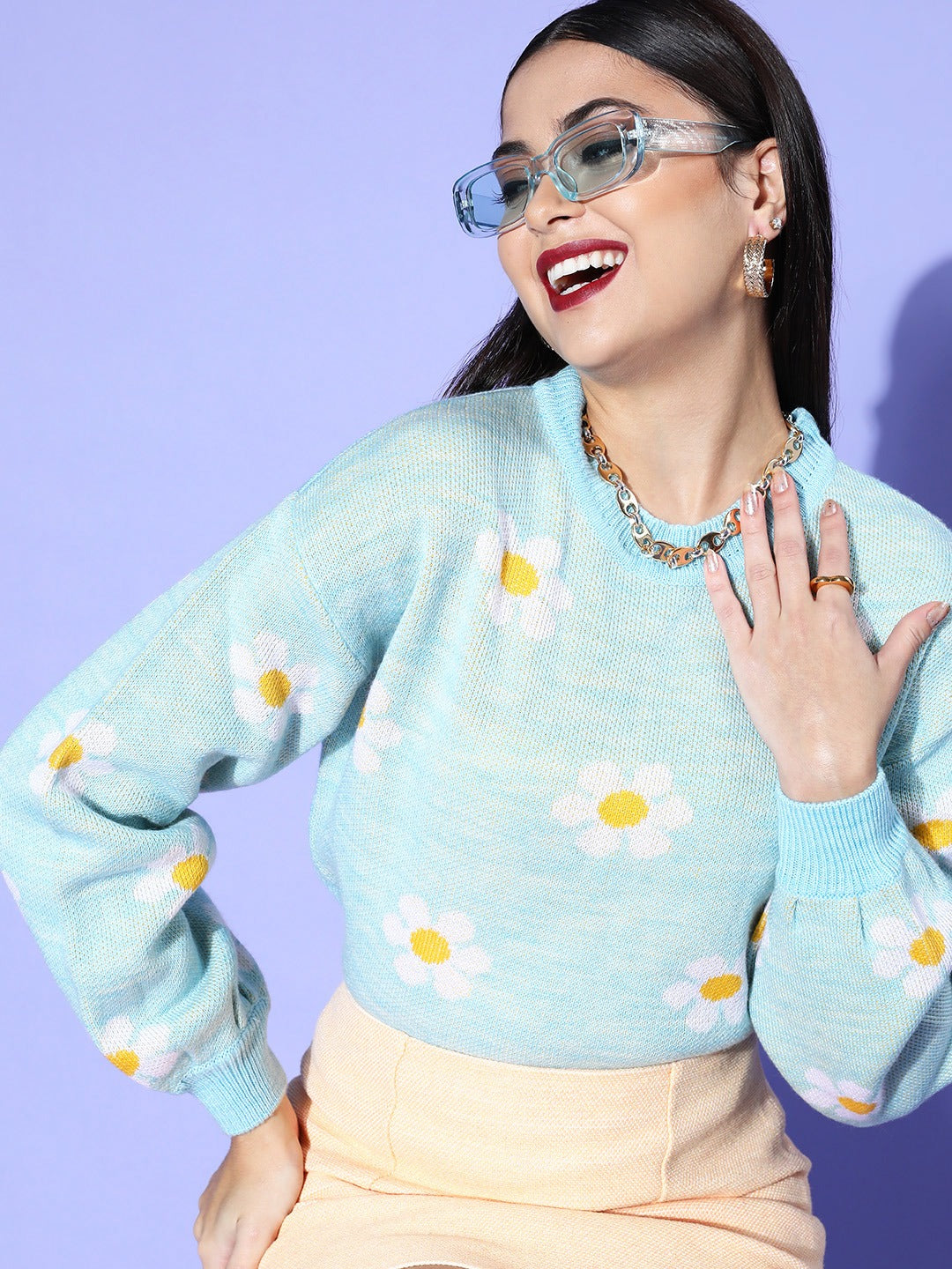 Berrylush Women Blue & White Floral Printed Round Neck Acrylic Straight Hem Regular Pullover