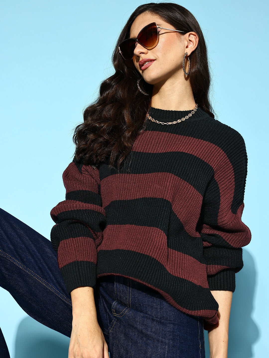 Incorporate striking and modern fashion elements in your layering line-up by choosing this stylish Striped Black and Rust Red Round Neck Ribbed Hem Regular Pullover designed by Berrylush for its latest winter wear collection. Decked with a striped profile that leaves a striking fashionable impression on this pullover with captivating charm. Spun from lightweight polyester fabric that keeps this pullover breathable with a cosy feel and irritation-free touch to your skin. The pullover style gives you a practical fit with an ease-wearing feature and clean sheen. Complete your casual look beautiful by wearing this pullover with dark blue denim jeans, a golden neckpiece, silver hoop earrings, rust-red loafers, and a matching side bag.