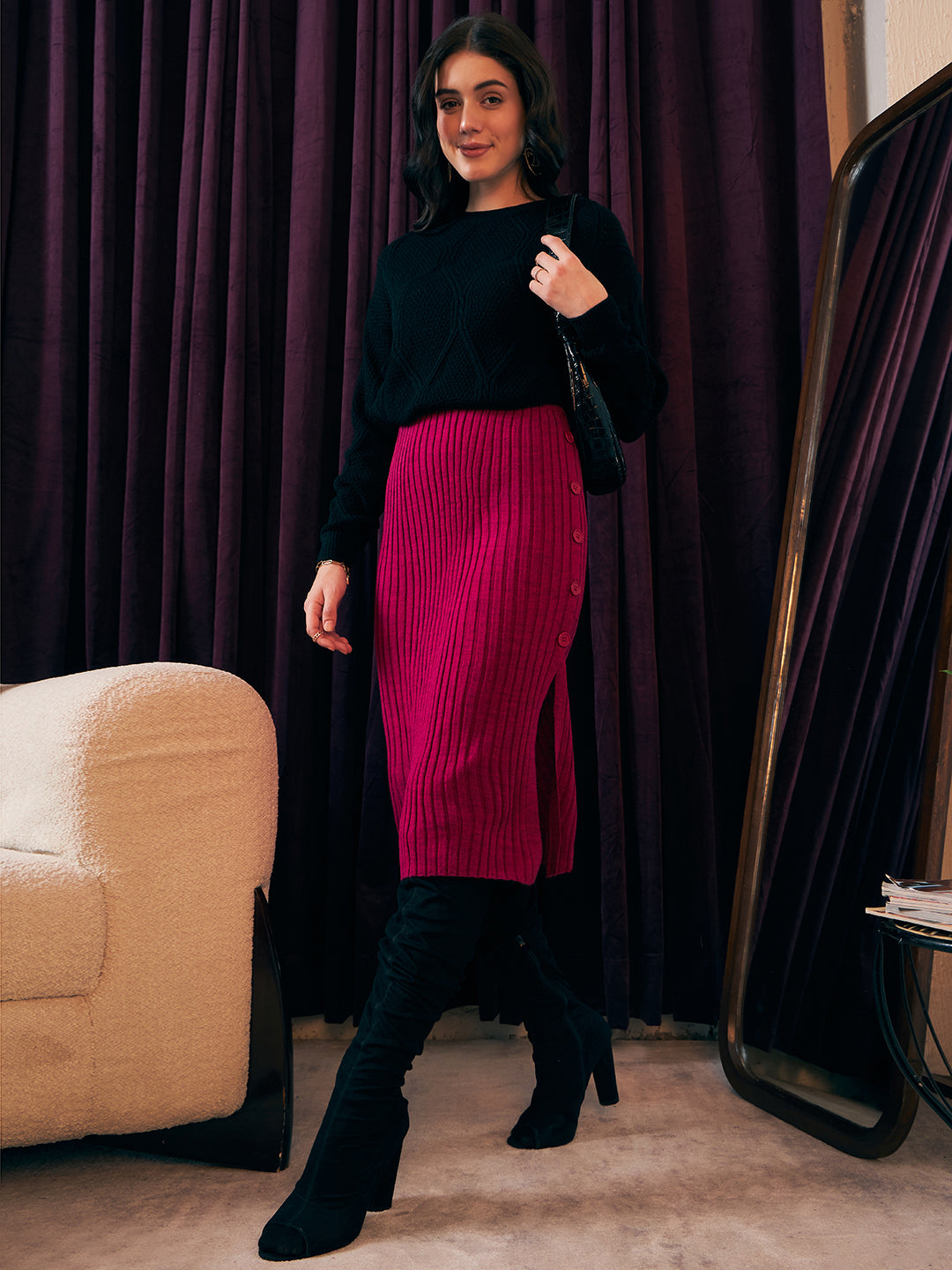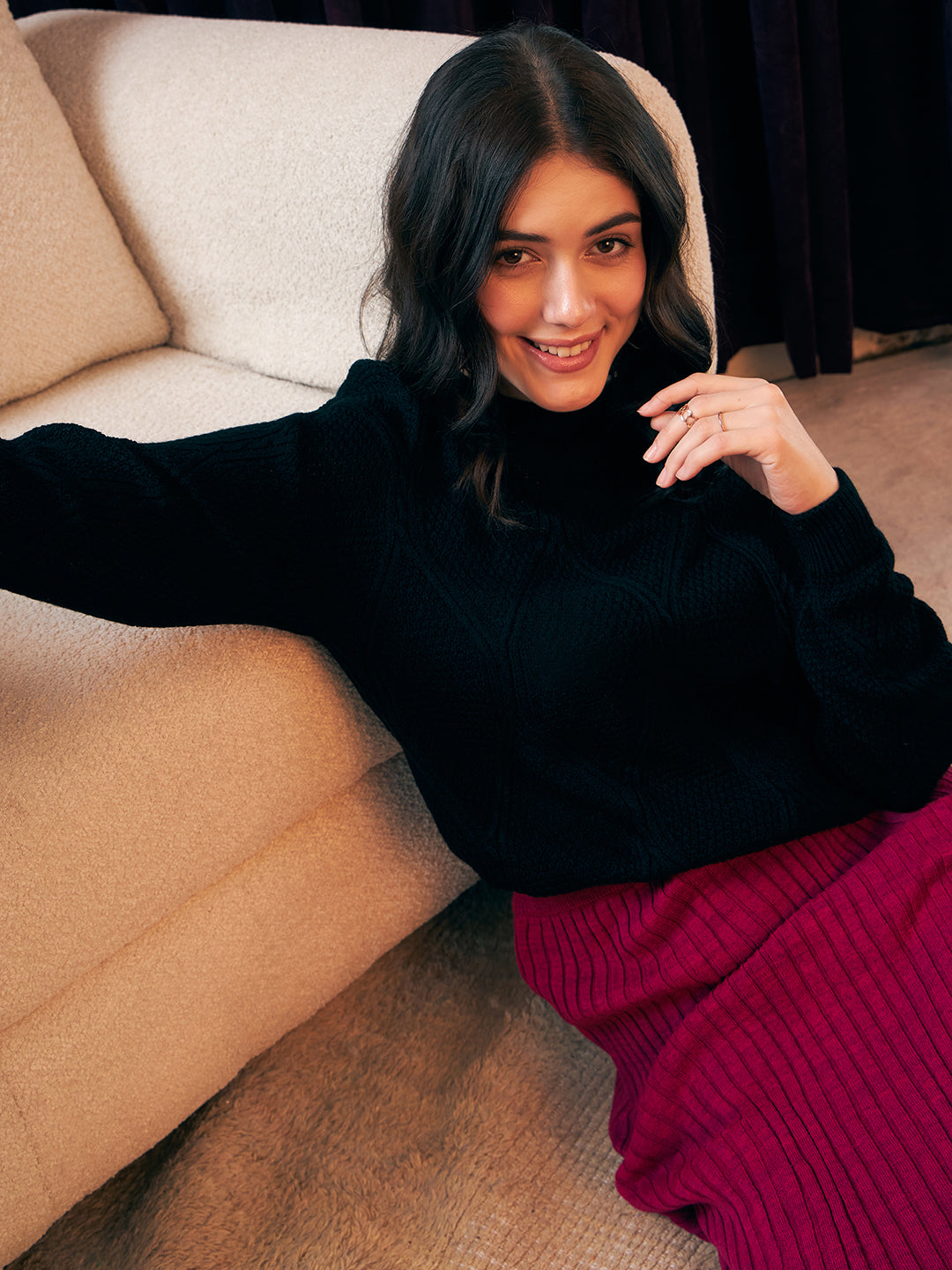 Wrap yourself in the sleek elegance of Berrylush's Solid Black Round Neck Acrylic Ribbed Hem Knitted Regular Sweater. This exquisite piece is a wardrobe must-have, perfectly blending comfort and style for any casual setting. Crafted from premium acrylic fabric, it features a soft, knitted weave that promises warmth and durability without compromising on breathability. The classic round neckline and long sleeves offer a timeless appeal, while the ribbed hemline adds just enough detail to keep things interesting. Its opaque finish ensures versatility across occasions. Whether you're out for coffee or cosied up at home, this regular-fit sweater is your go-to choice for effortless chicness.