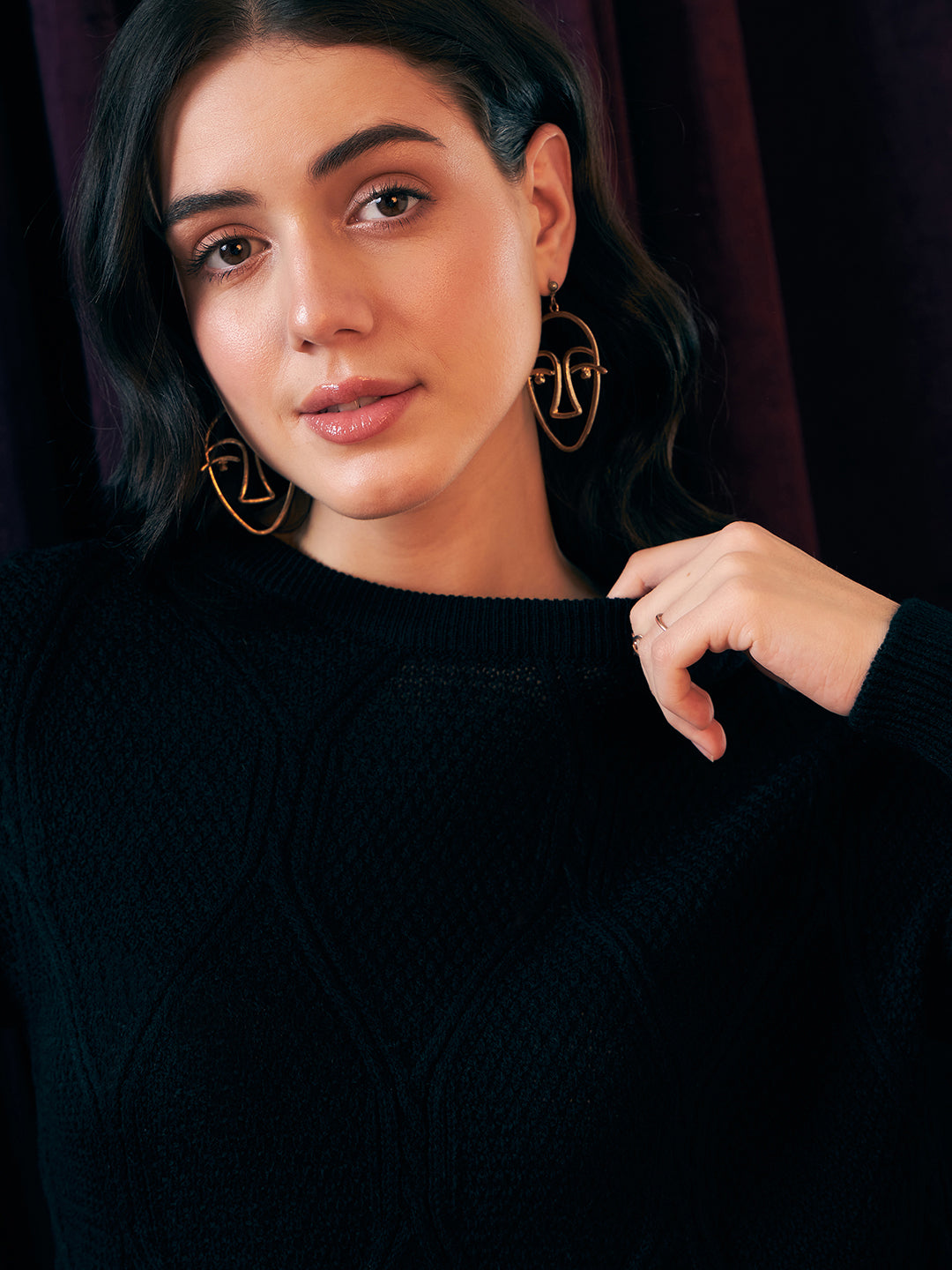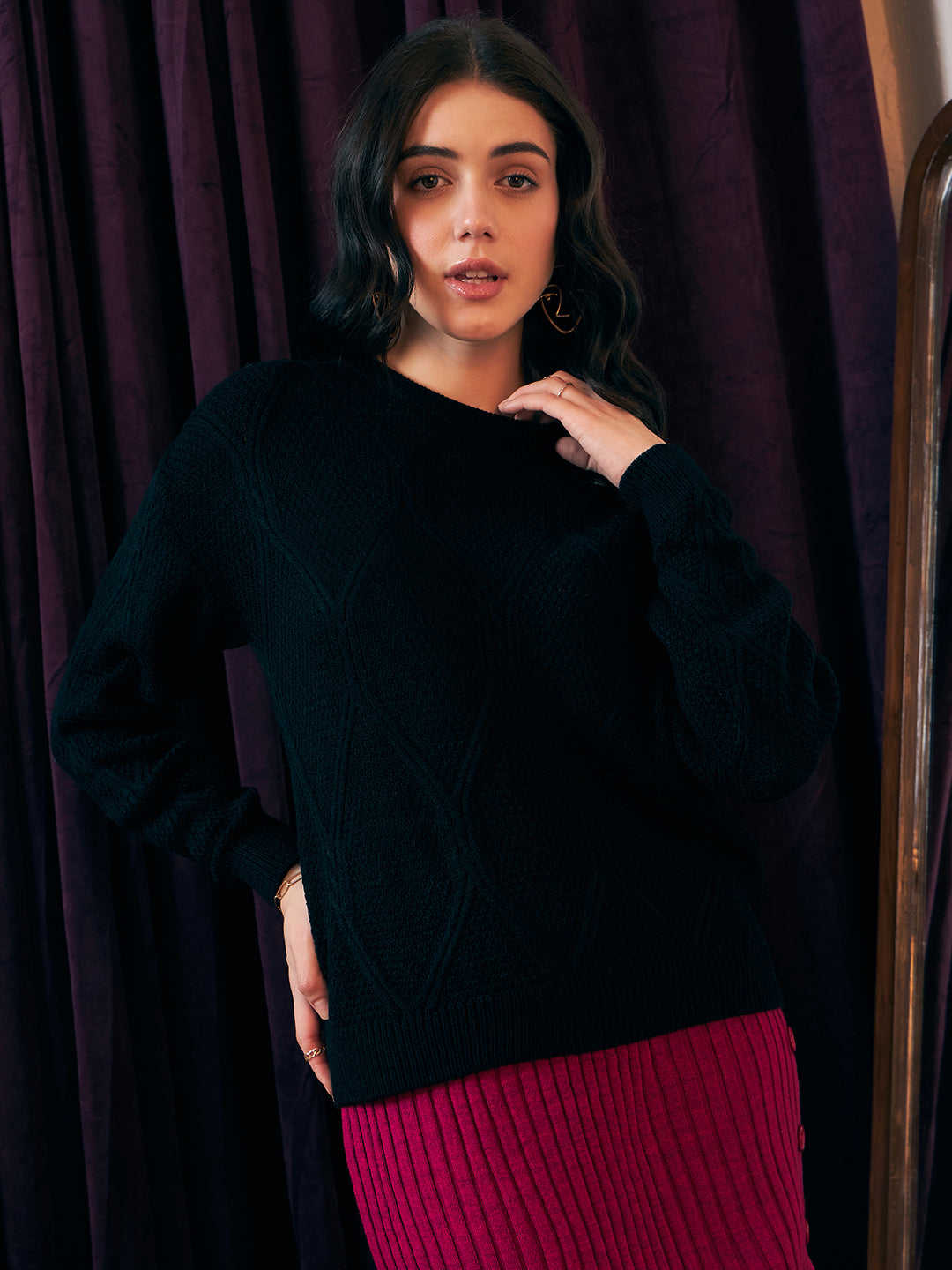 Berrylush Women Solid Black Round Neck Acrylic Ribbed Hem Knitted Regular Sweater