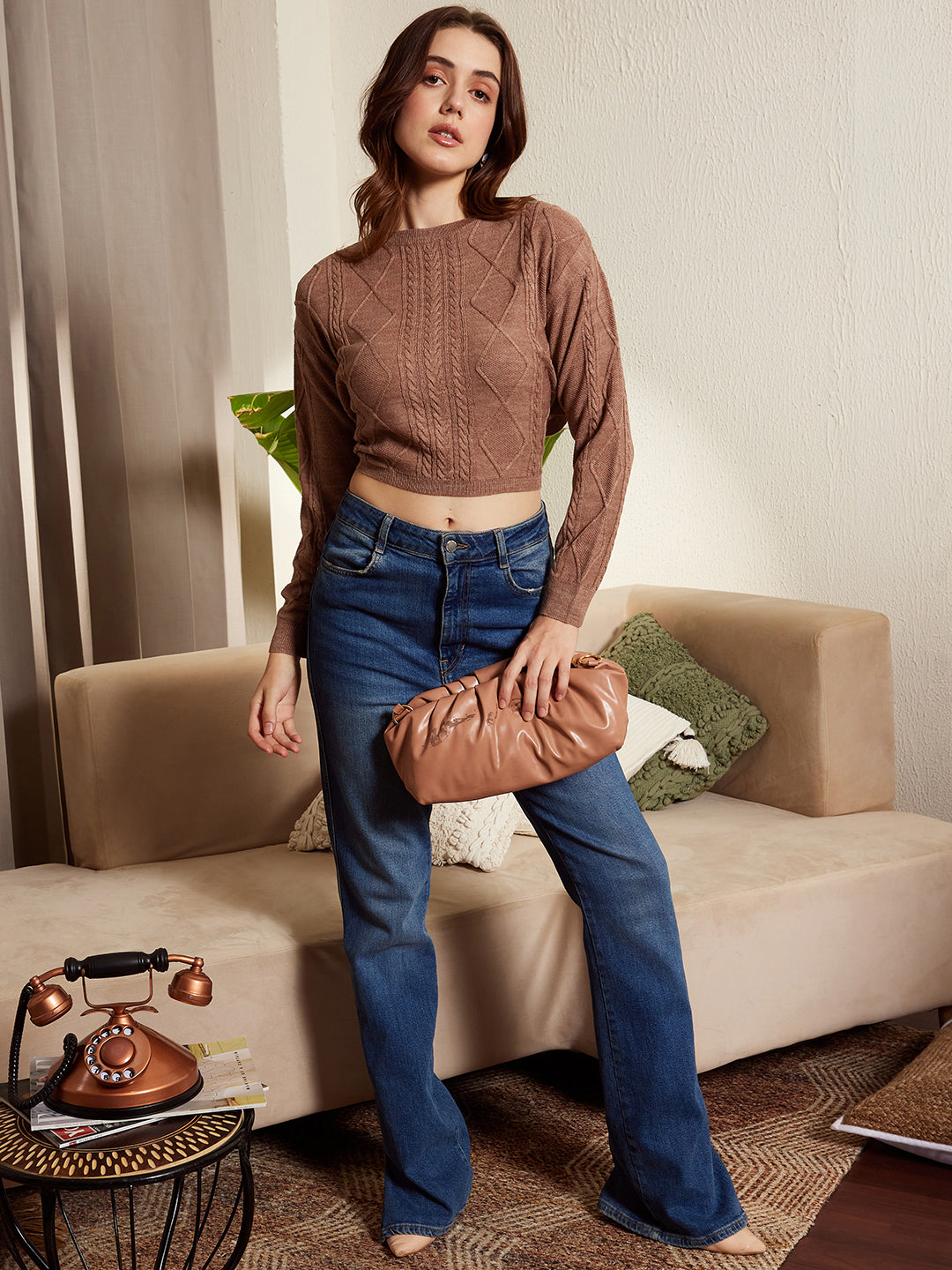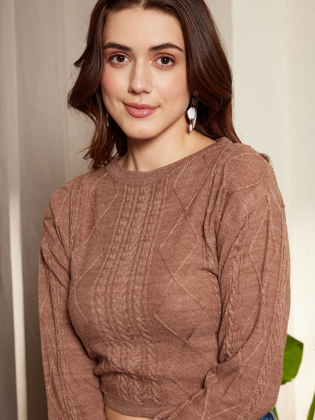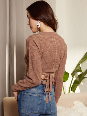 Berrylush Women Solid Brown Round Neck Acrylic Back Tie-Up Ribbed Hem Cable Knitted Crop Sweater