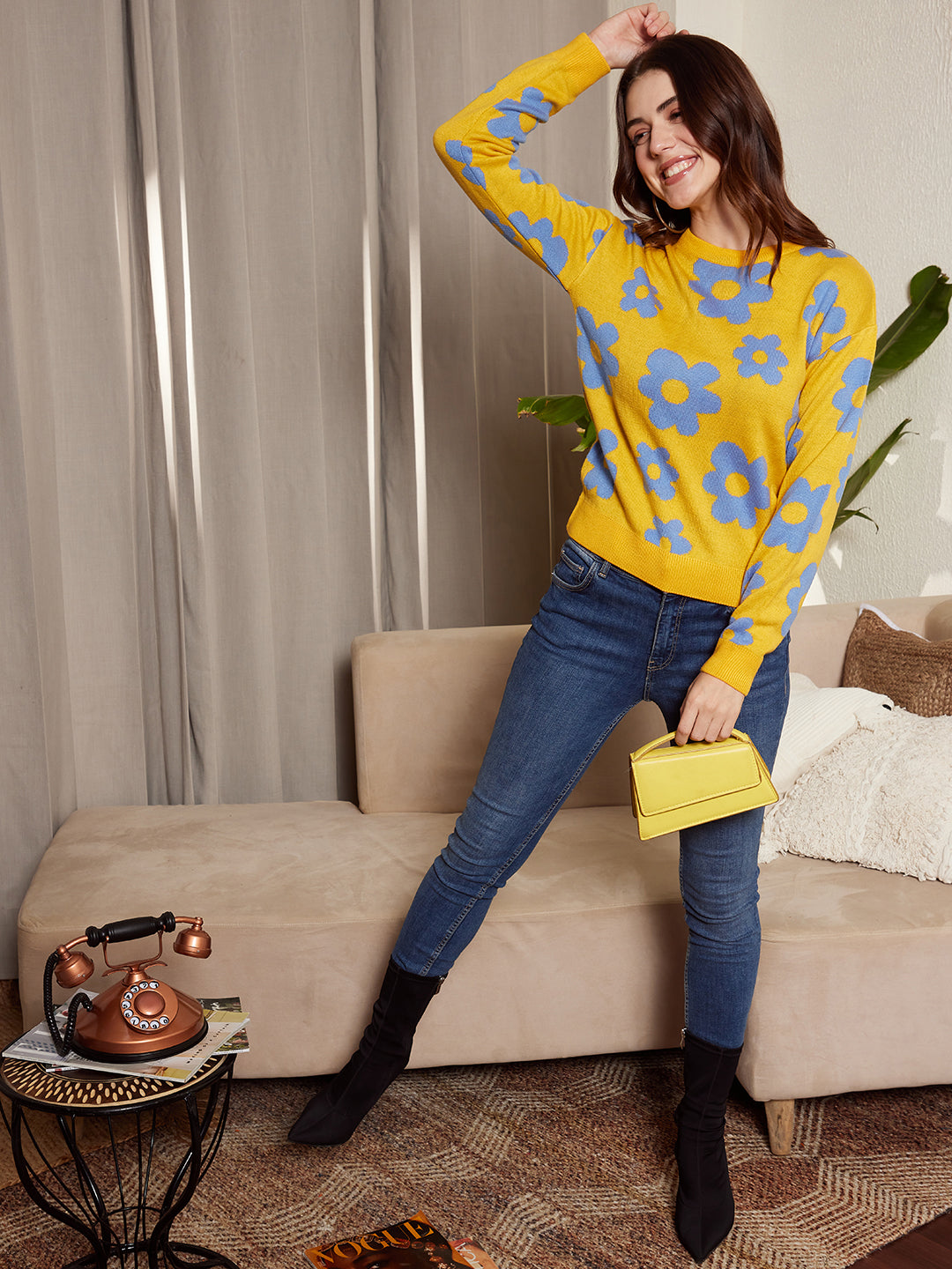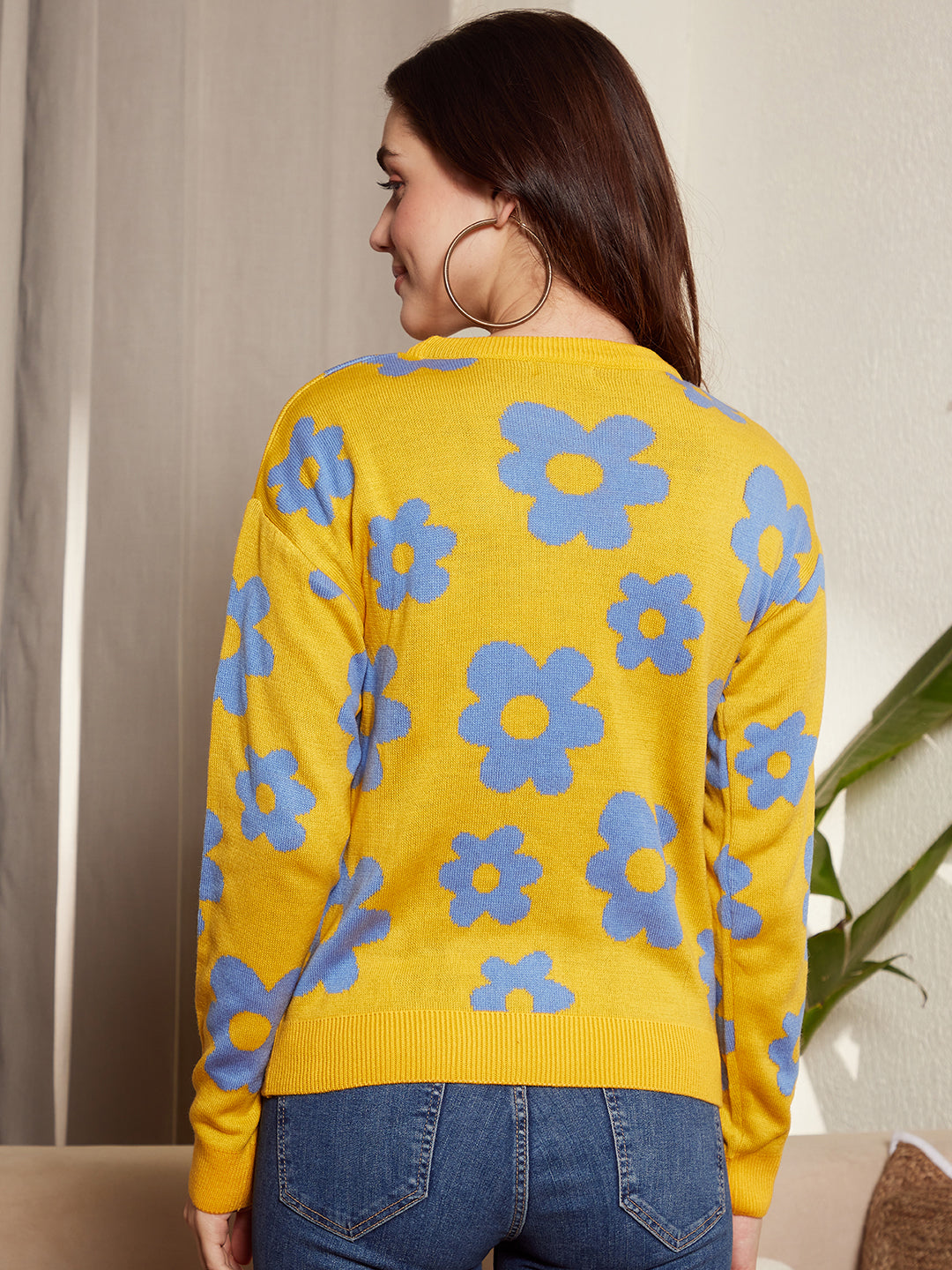 - Yellow and blue floral print gives this sweater a refreshing look with a tropical vibe
