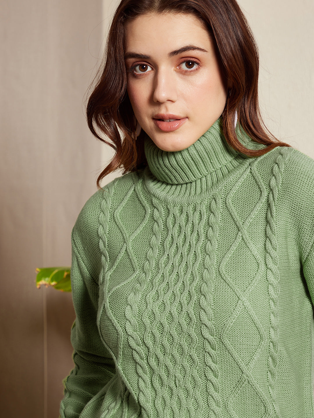 Berrylush Women Solid Light Green Turtle Neck Acrylic Ribbed Hem Cable Knitted Regular Sweater