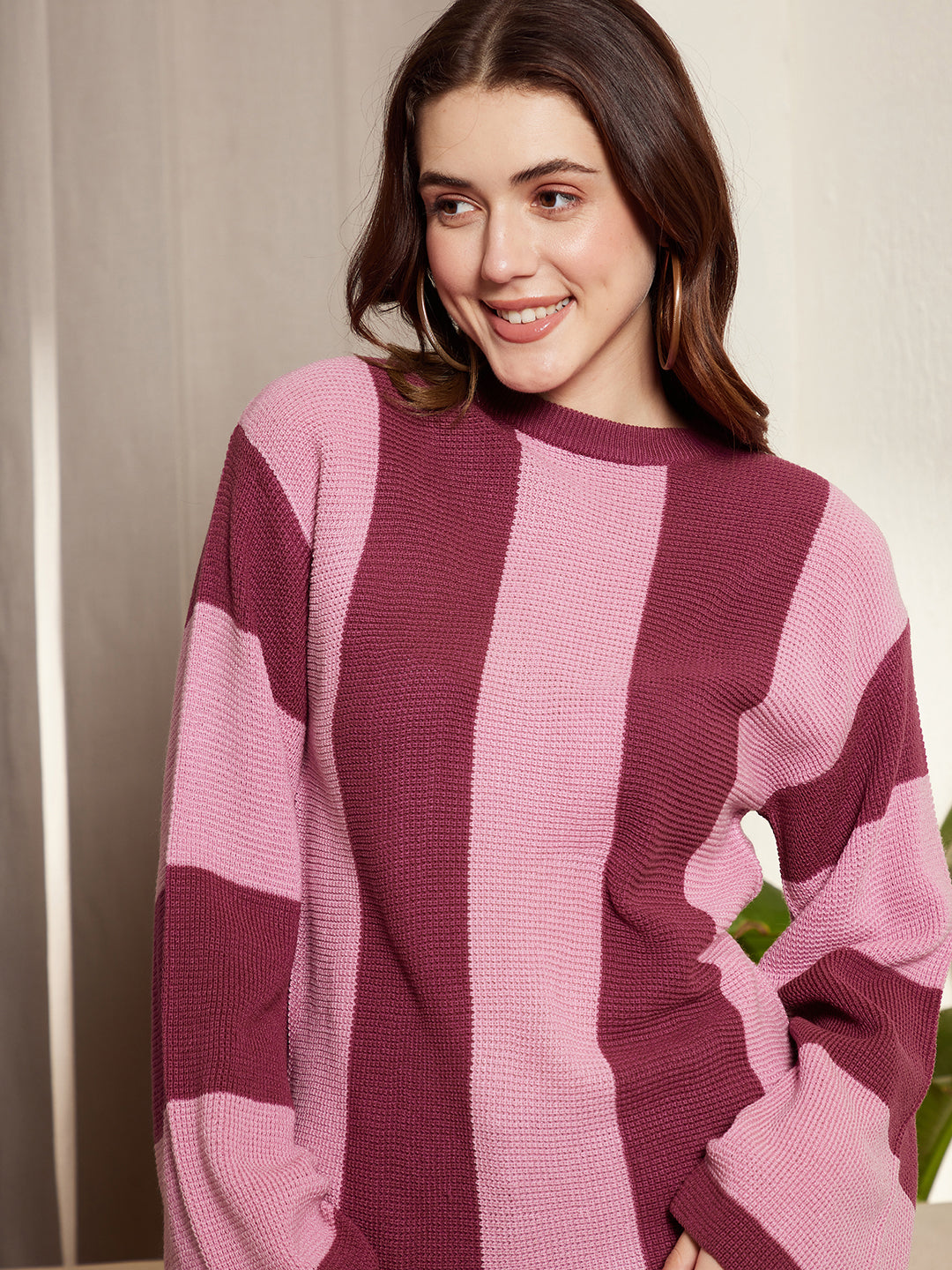 Berrylush Women Pink & Red Frenchy Two-Tone Printed Round Neck Drop-Shoulder Sleeves Ribbed Hem Regular Sweater