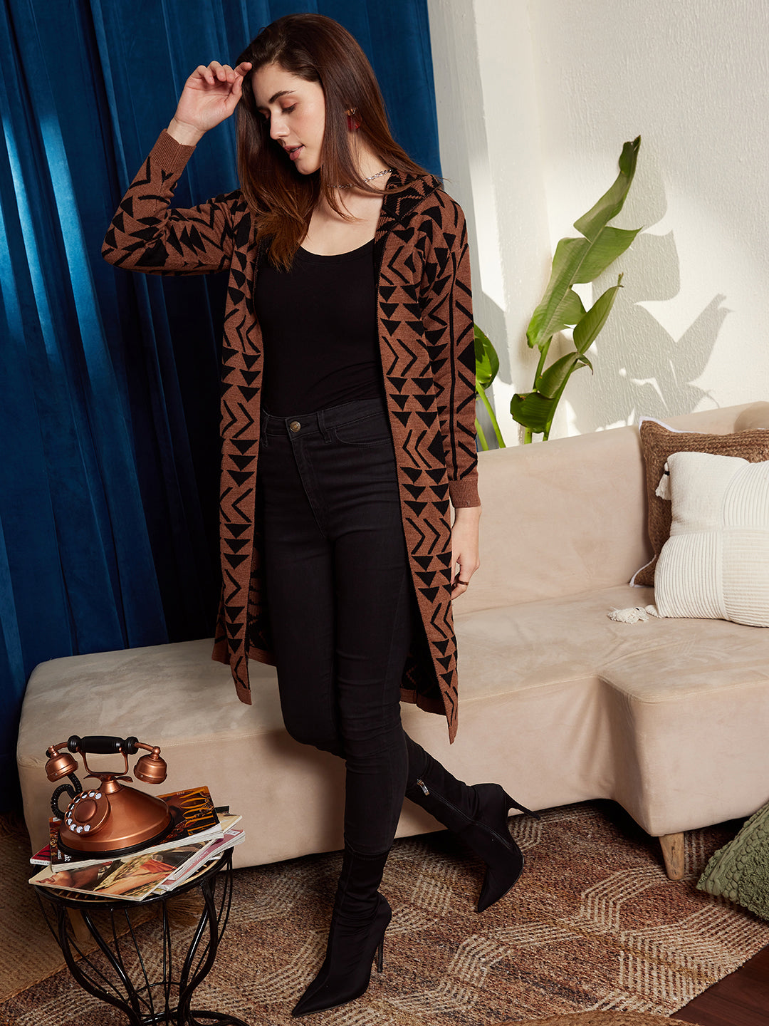 Berrylush Women Brown & Black Geometric Printed Hood Neck Drop-Shoulder Sleeves Open-Front Ribbed Hem Longline Cardigan