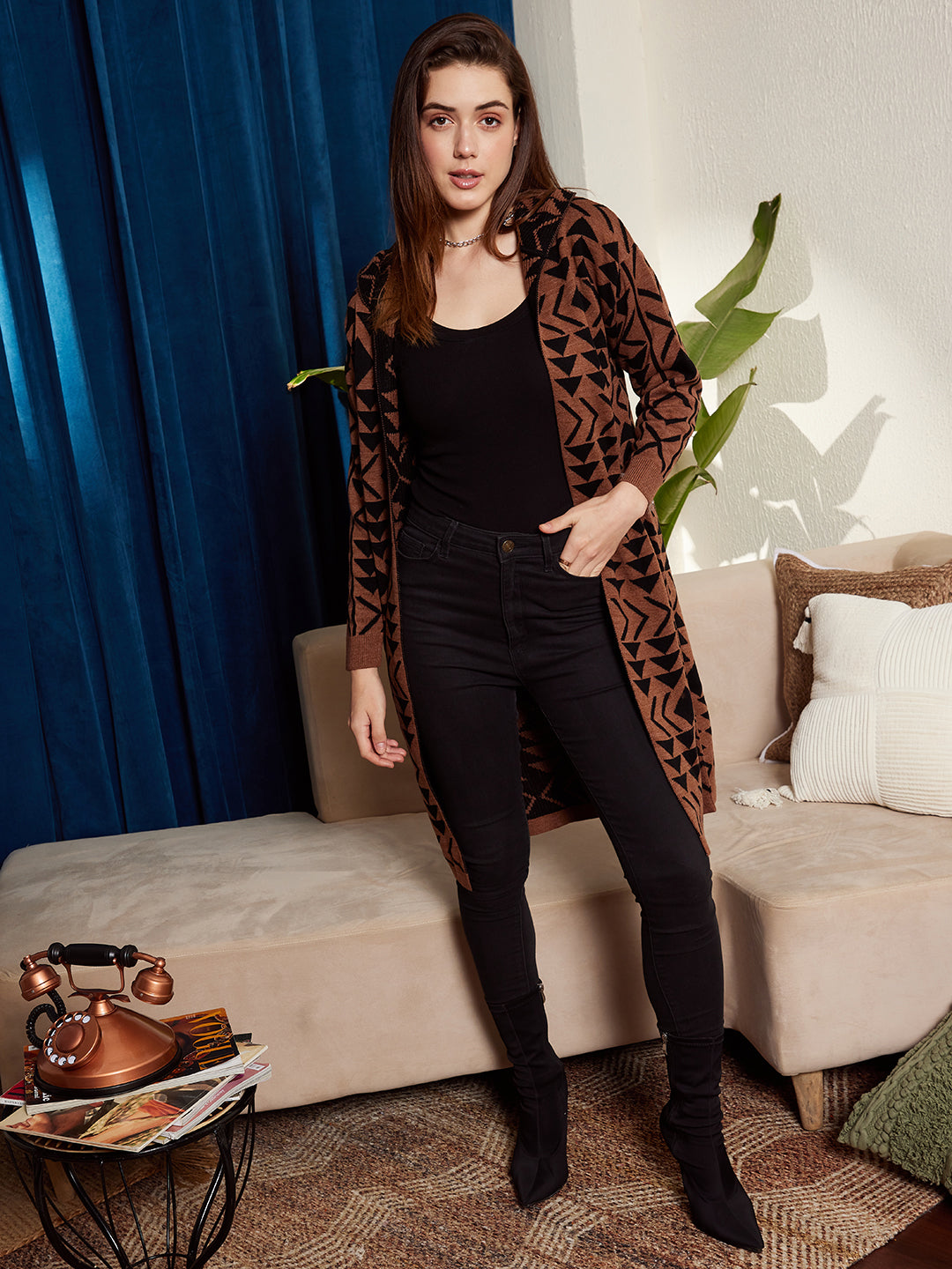 Introducing the latest addition to your casual wardrobe from Berrylush: the Brown & Black Geometric Printed Longline Cardigan. This exquisite piece combines comfort with style, featuring a captivating geometric print that adds a modern twist to any outfit. Crafted from high-quality acrylic fabric, its knitted weave ensures warmth and durability, making it perfect for those crisp days. The hood neckline and drop-shoulder long sleeves offer a relaxed fit while contributing an air of laid-back elegance. Its open-front design allows for versatile styling options, and the ribbed hemline adds texture and flair to this unique garment. With its opaque finish ensuring coverage, this cardigan is not just about looks but also about providing cosy comfort without compromising on style.