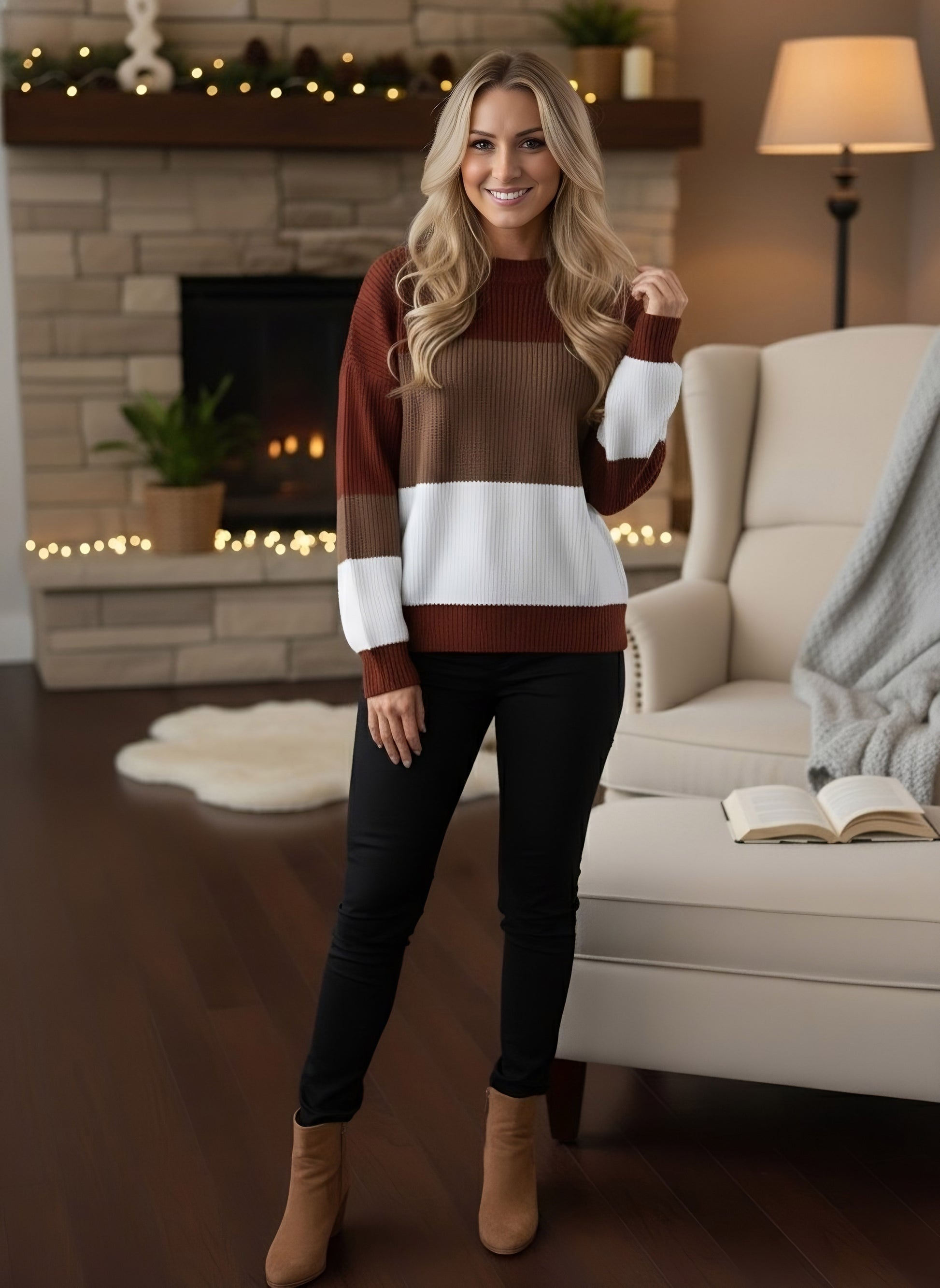 Berrylush Women Brown & White Striped Pattern Round Neck Acrylic Straight Hem Regular Pullover