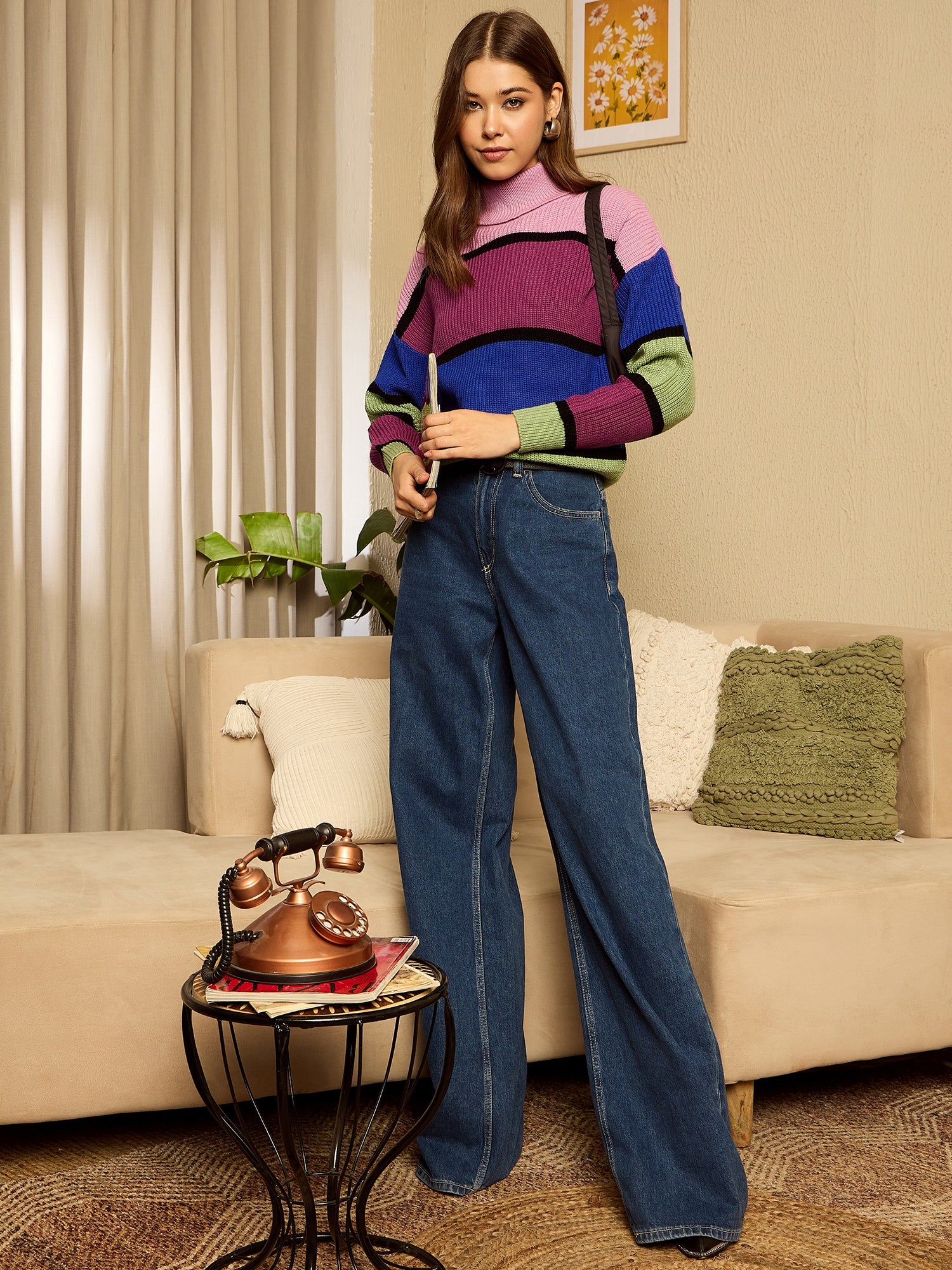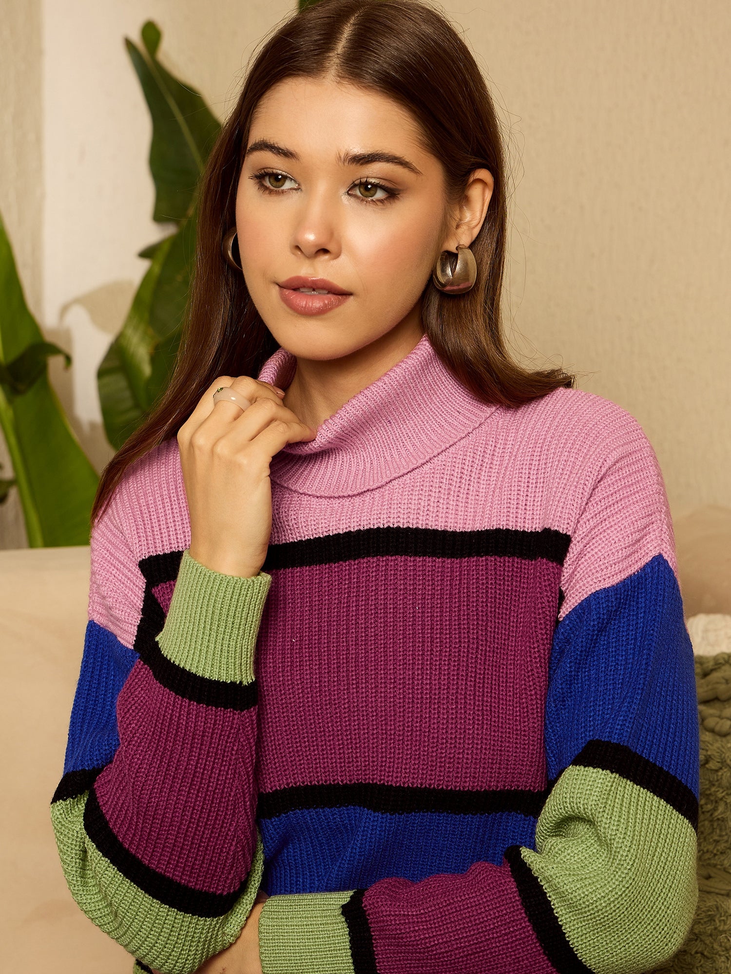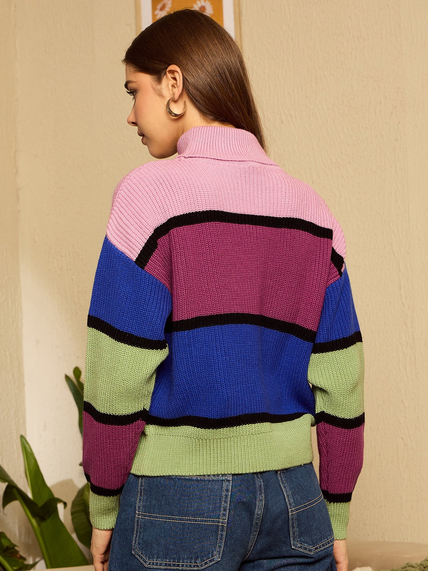 Berrylush Women Colourblocked Multicolour & Black Turtle Neck Drop-Shoulder Sleeves Acrylic Ribbed Hem Regular Pullover