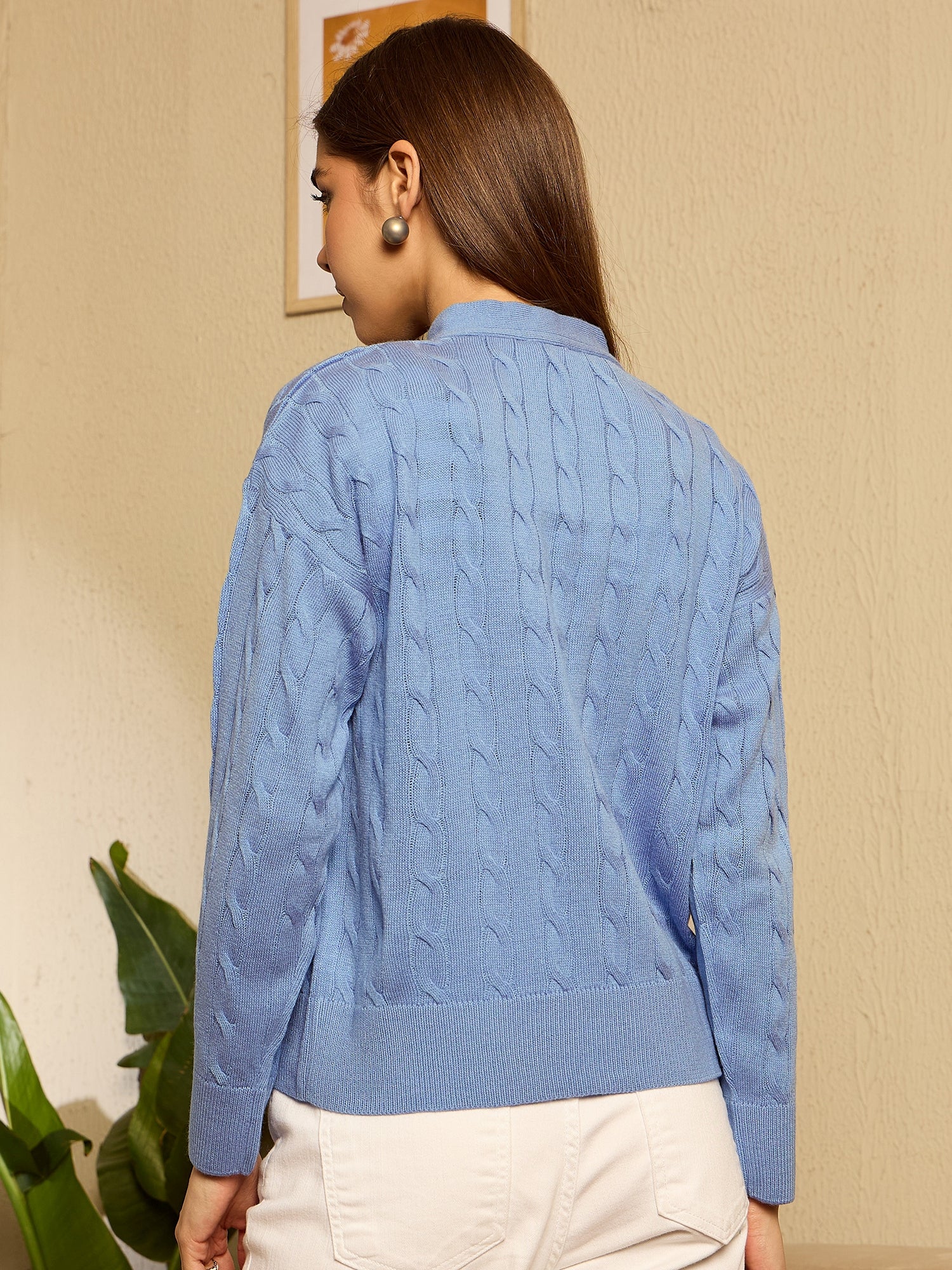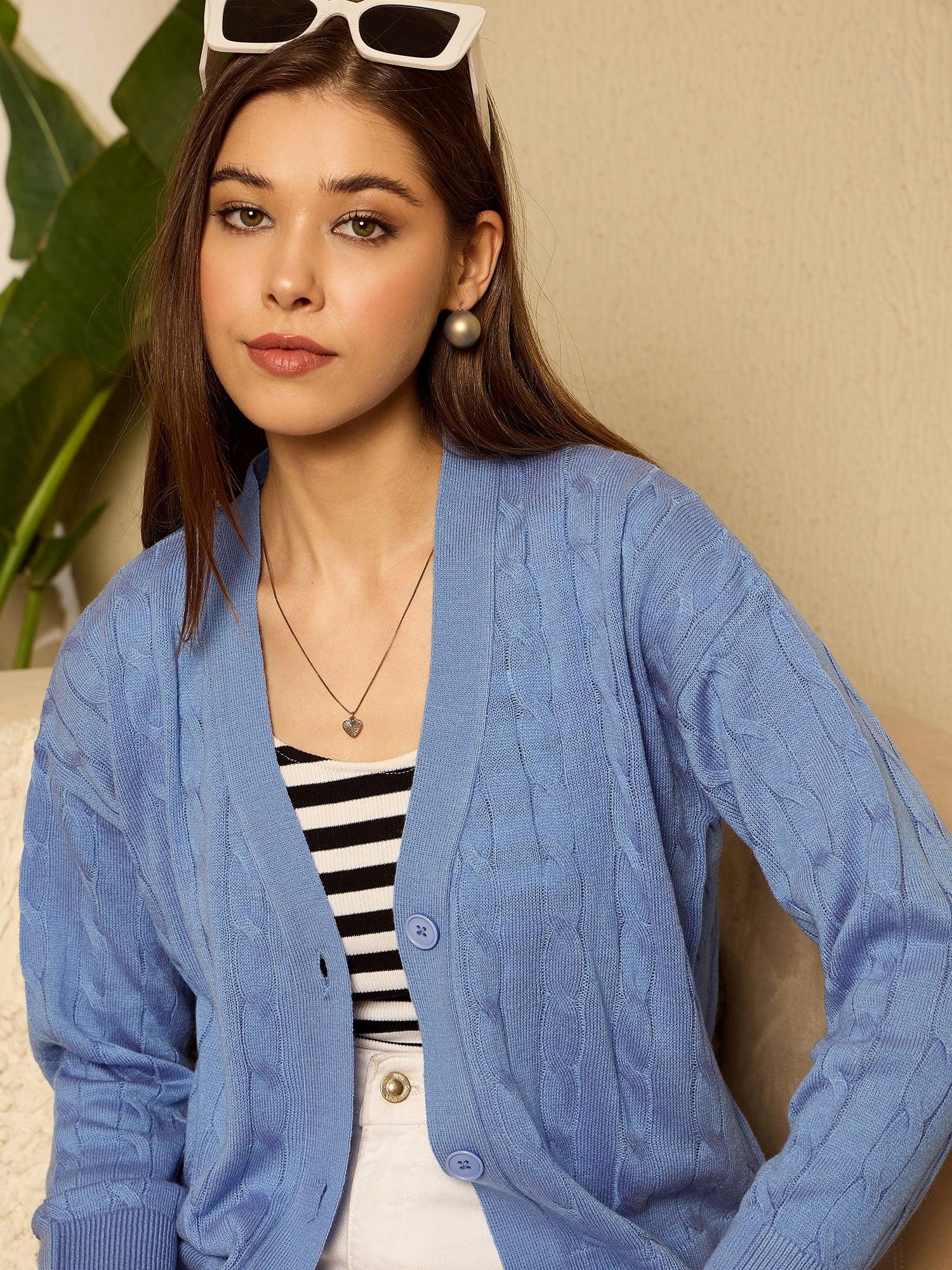Berrylush Women Solid Blue V-Neck Drop-Shoulder Sleeves Front Button-Up Acrylic Ribbed Hem Regular Cardigan